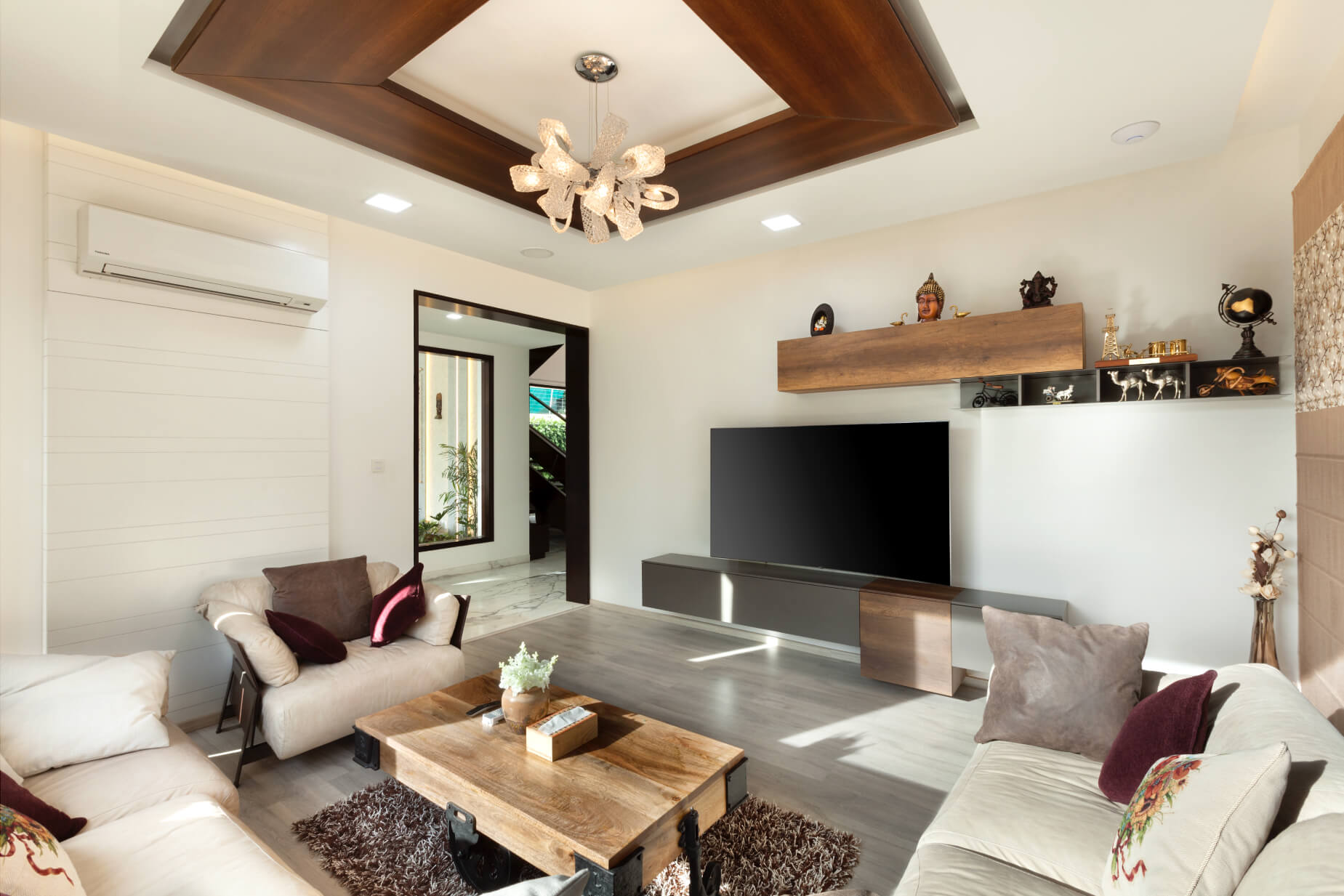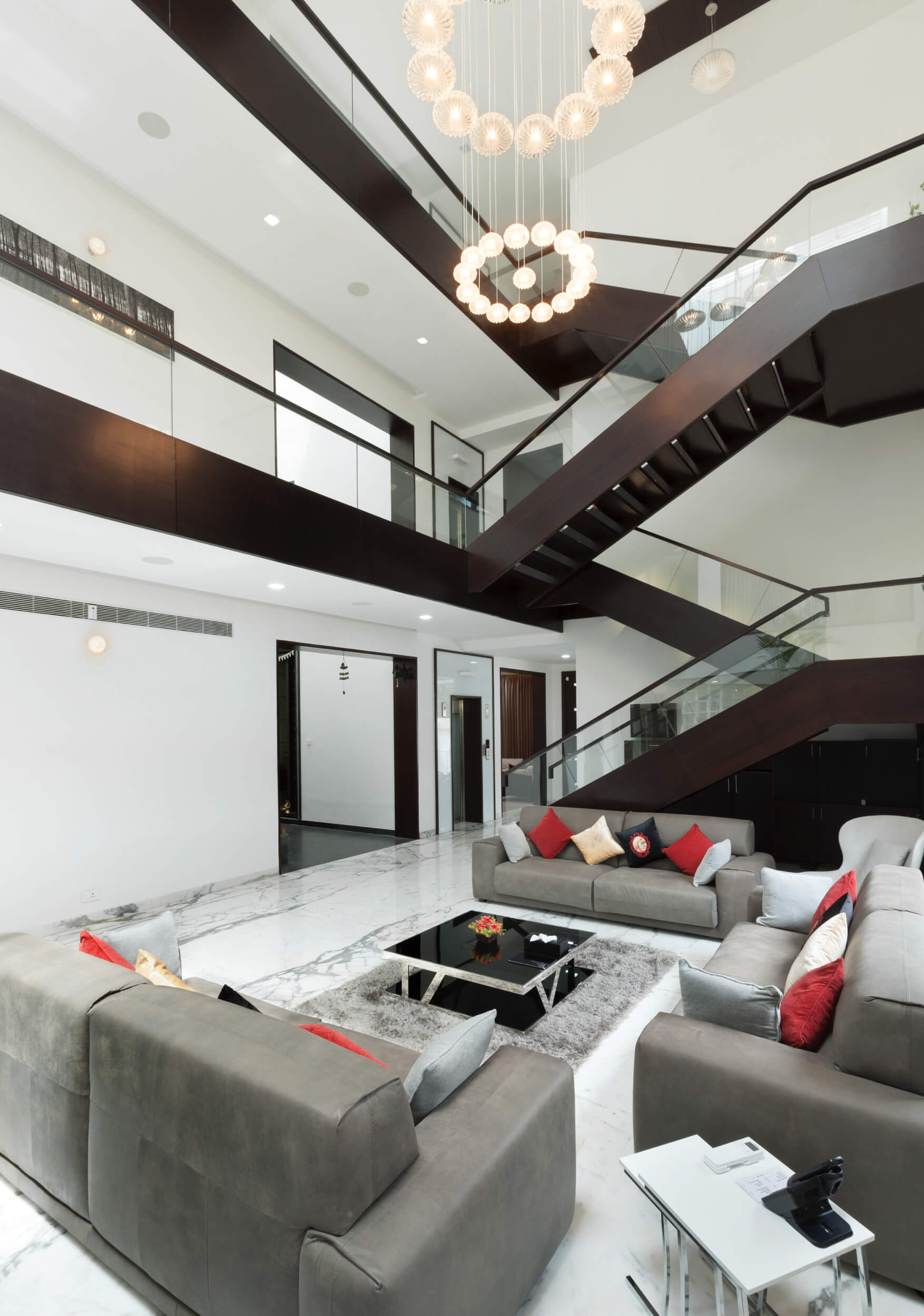 Atria boasts a minimalistic design palette while being engulfed in a thoughtfully landscaped garden. This zoning merges the boundaries between various privacy levels within a household and creates a tranquil space for the dwellers. The garden continues axially into the grand entrance, forming an enclosed courtyard and further followed by a triple-height central atrium. This atrium is a focal point that unites various volumes. During the day, light pouring in from the central atrium brings the house to life while at night, suspended chandeliers continue to illuminate and enhance the ambience.