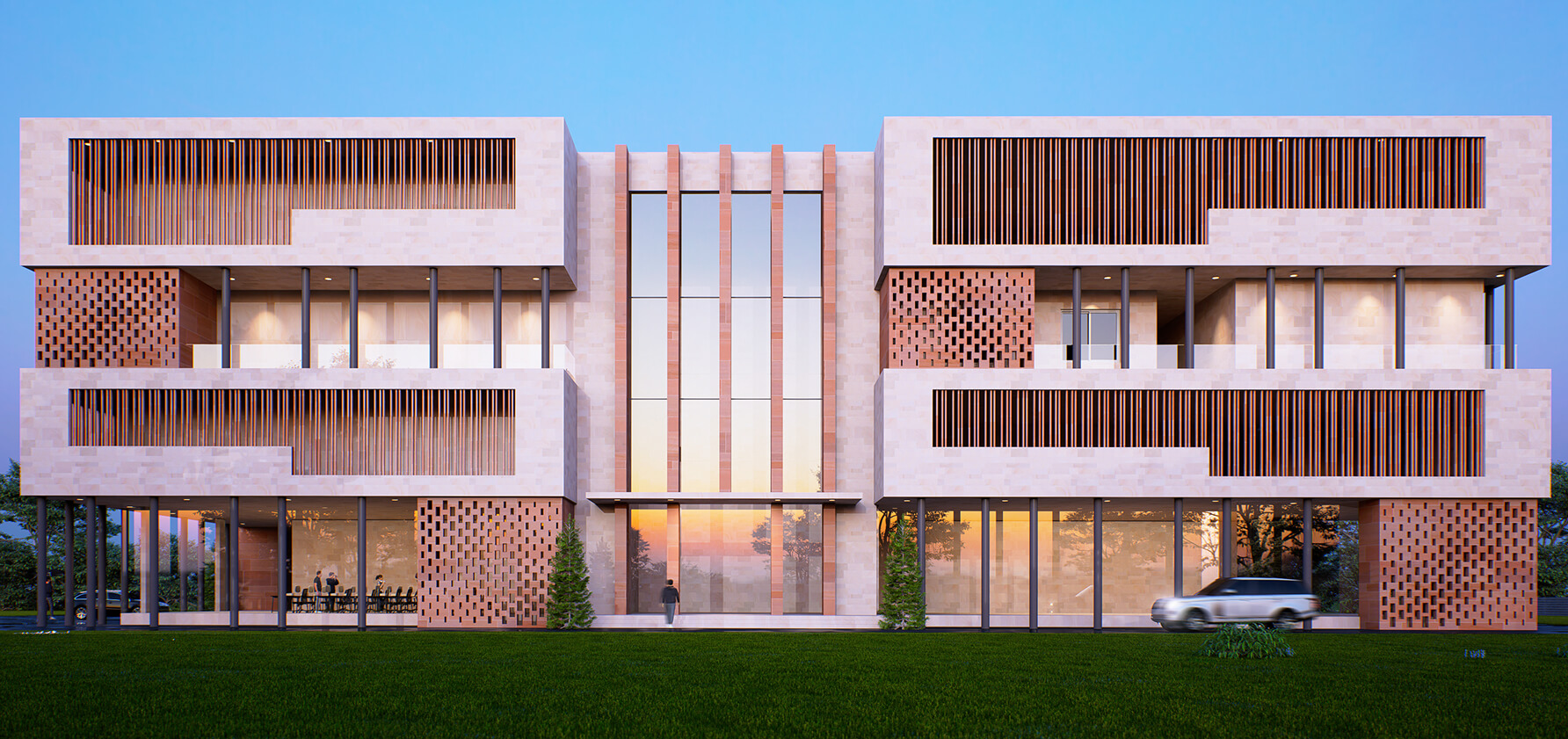An institutional structure heavily influenced by modern volumes. The contrasting use of grey and brown hues in several architectural elements of the facade creates a dynamic elevation from all viewpoints.