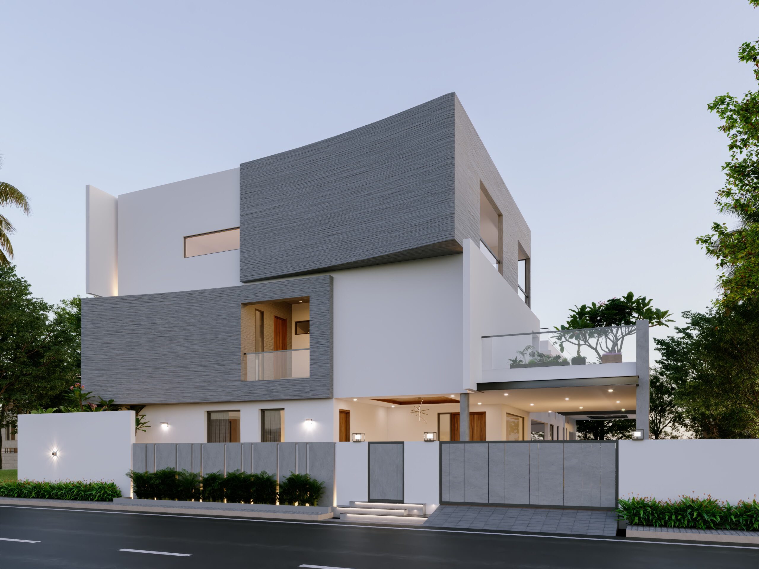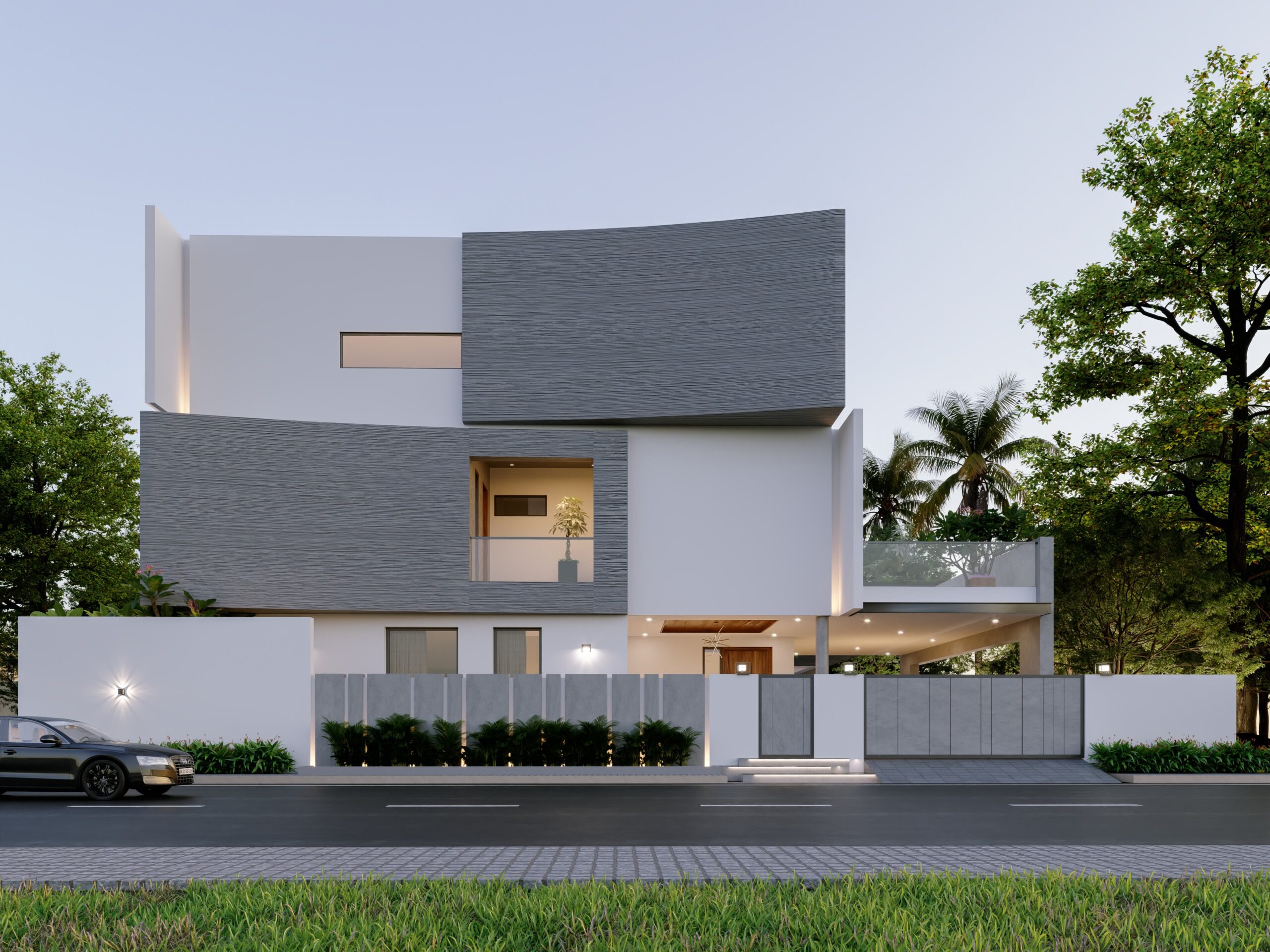 The harmonious juxtaposition of straight, smooth white walls, and grey and textured curvy walls shape an interesting facade for a residence.