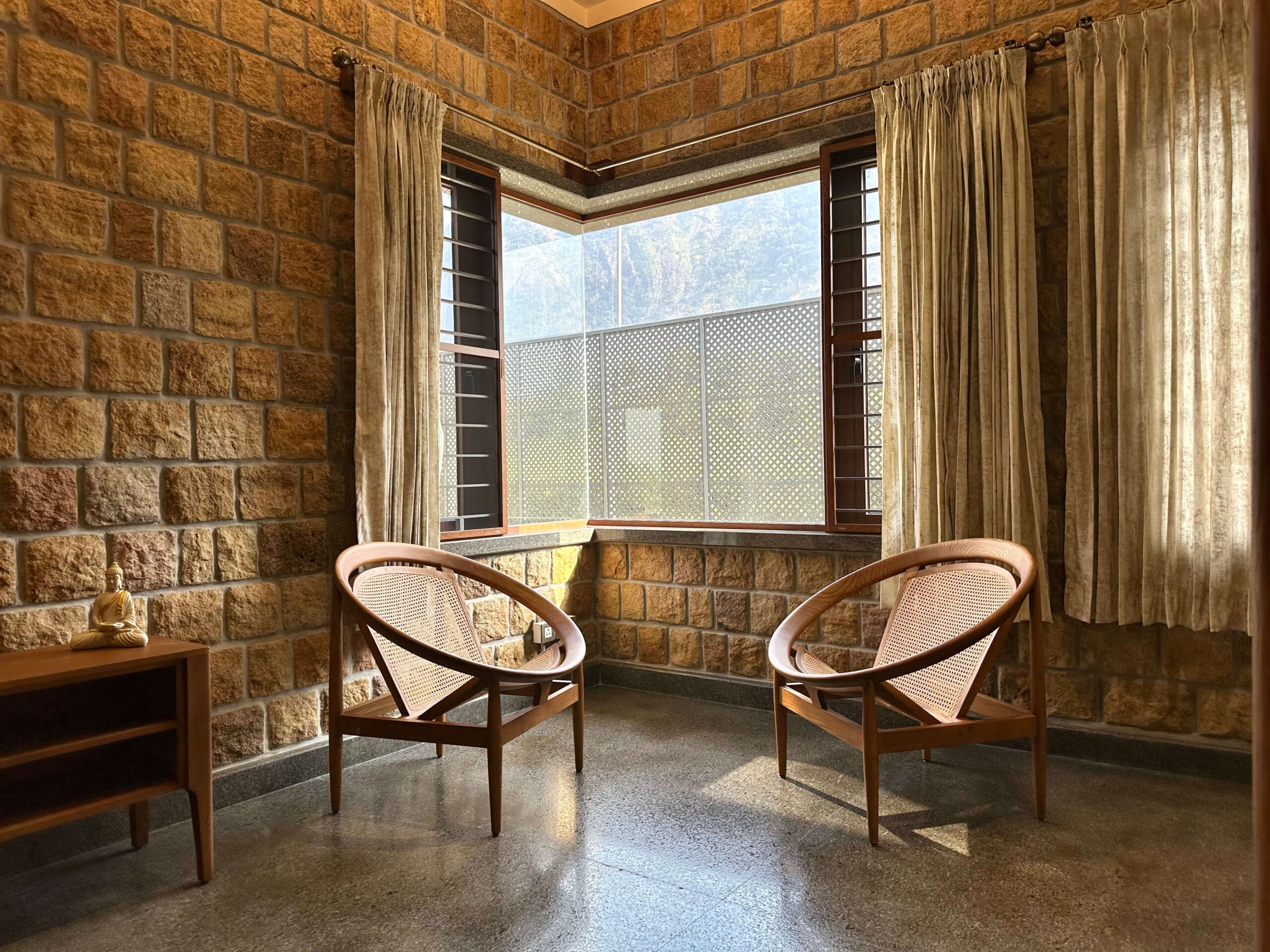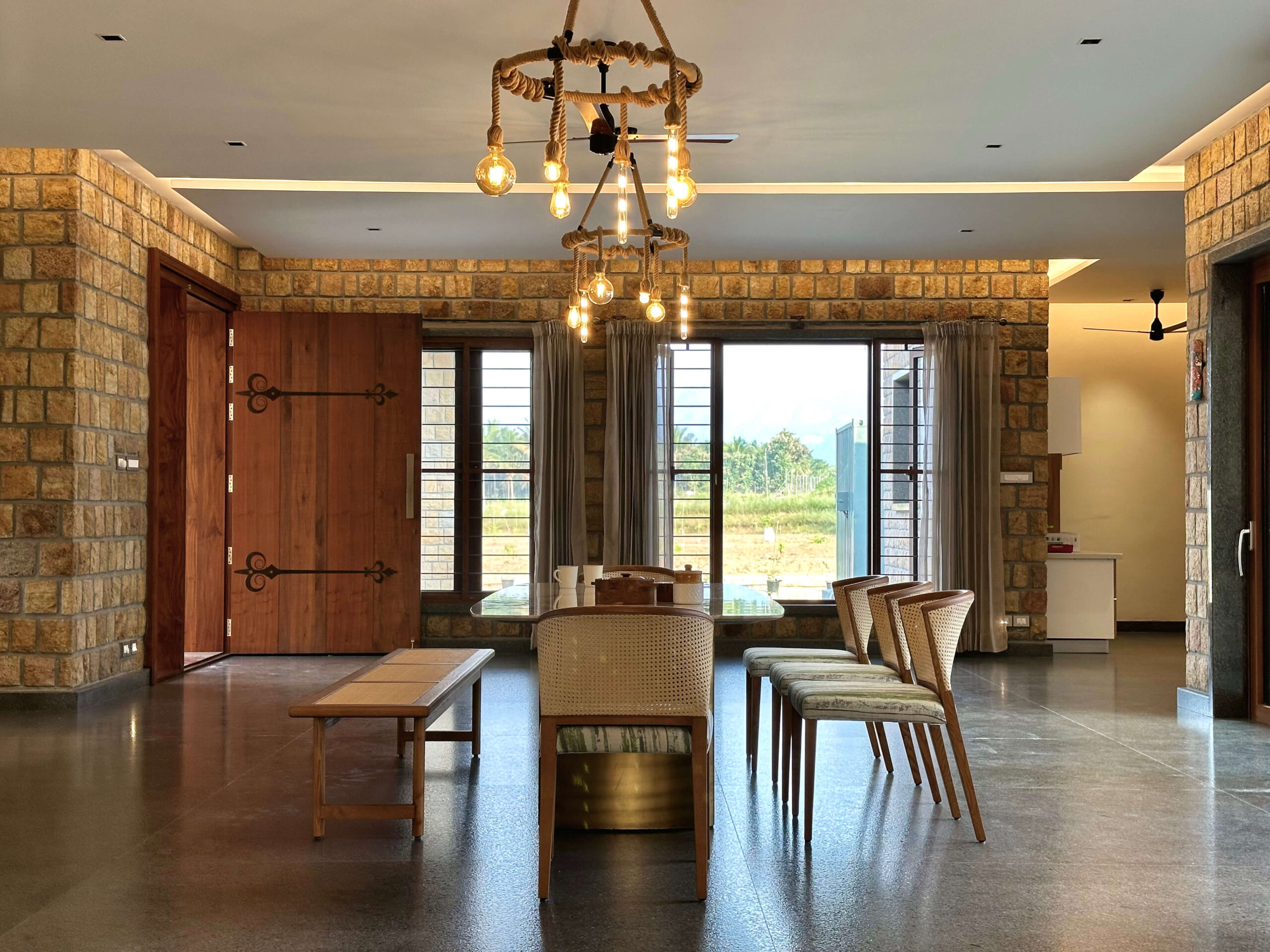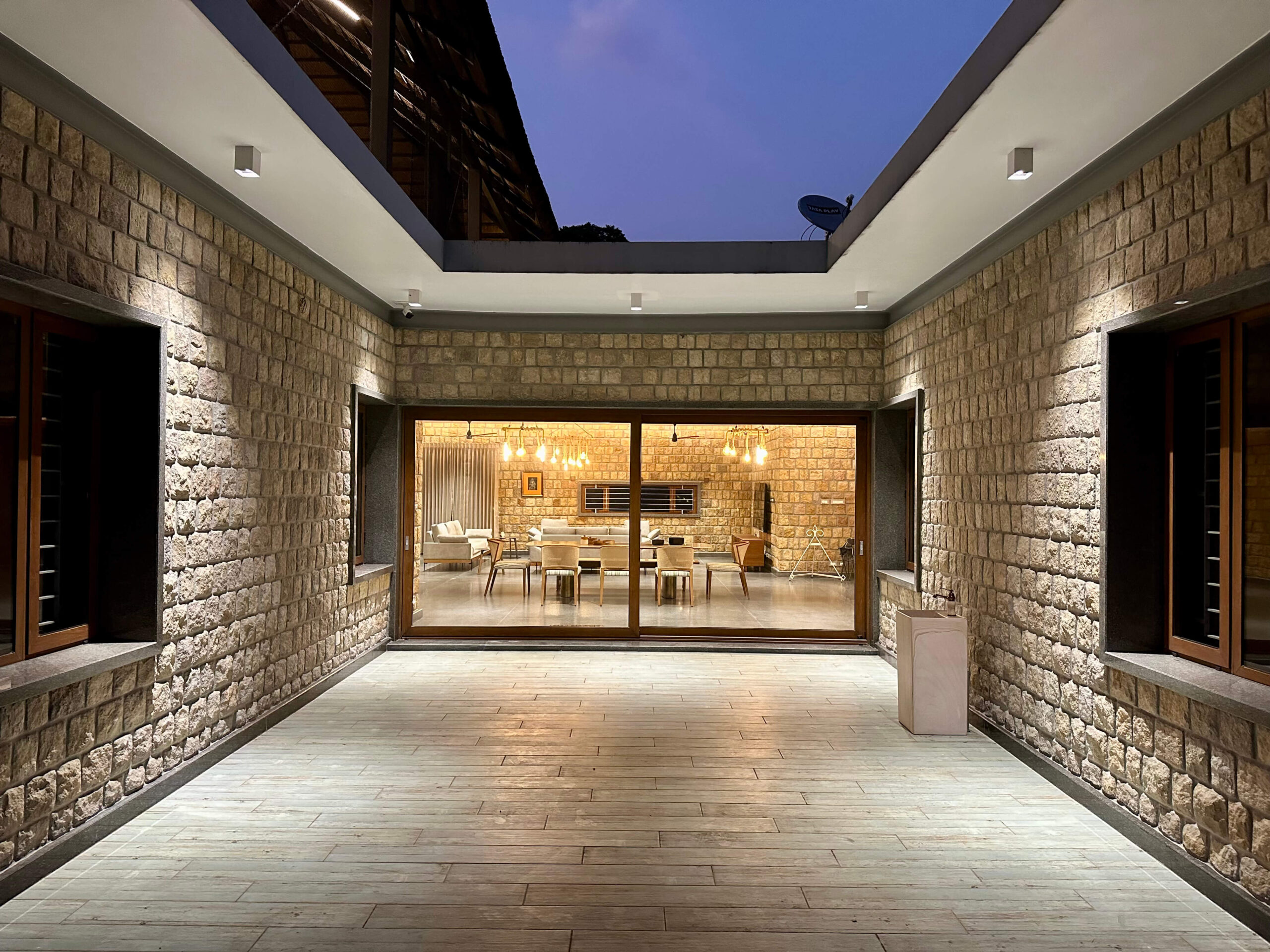 Nestled near the Western Ghats, where Nilgiris’ breath whispers, resides Evara, a second home, tucked away from the bustling city life of Coimbatore. Camouflaged within its locale, this abode reuses materials which were originally used for a factory. From the coursed ashlar masonry to the walnut veneer, the indoors seamlessly mend with the outdoors creating a smooth transition and movement. In its commitment to living with nature, Evara stands as a testament to sustainability and well-being.
