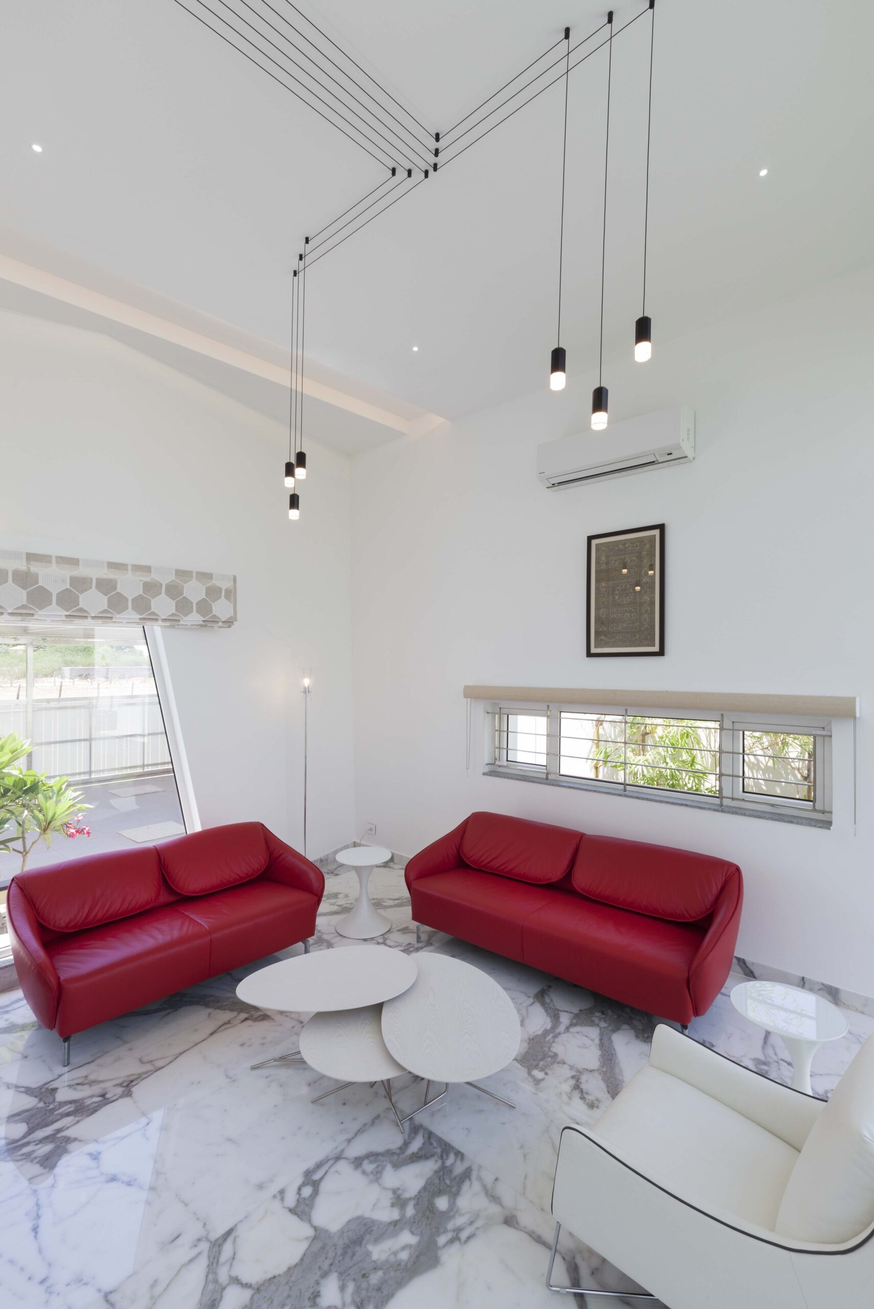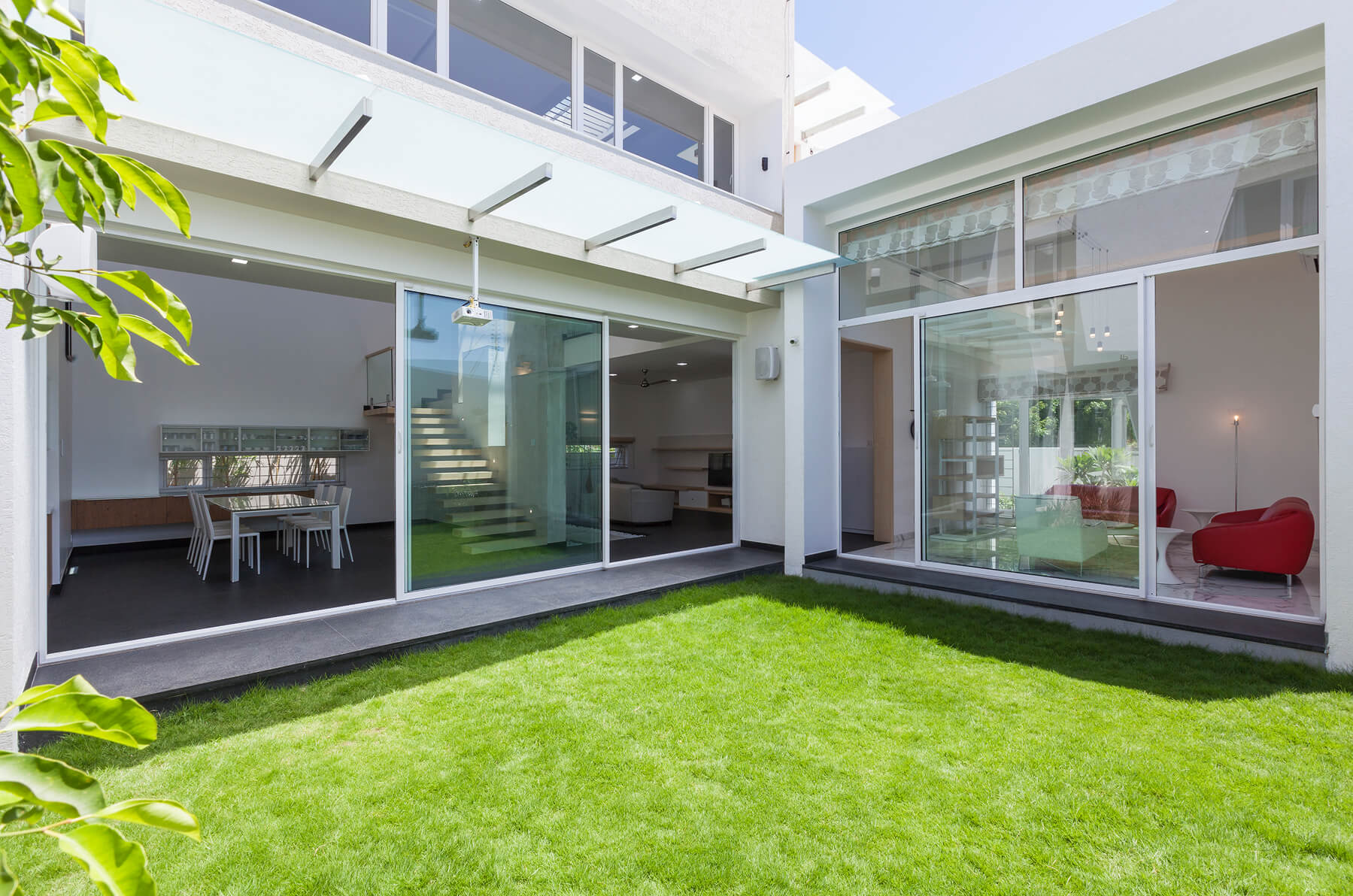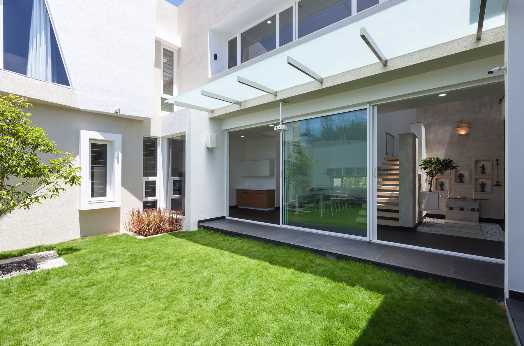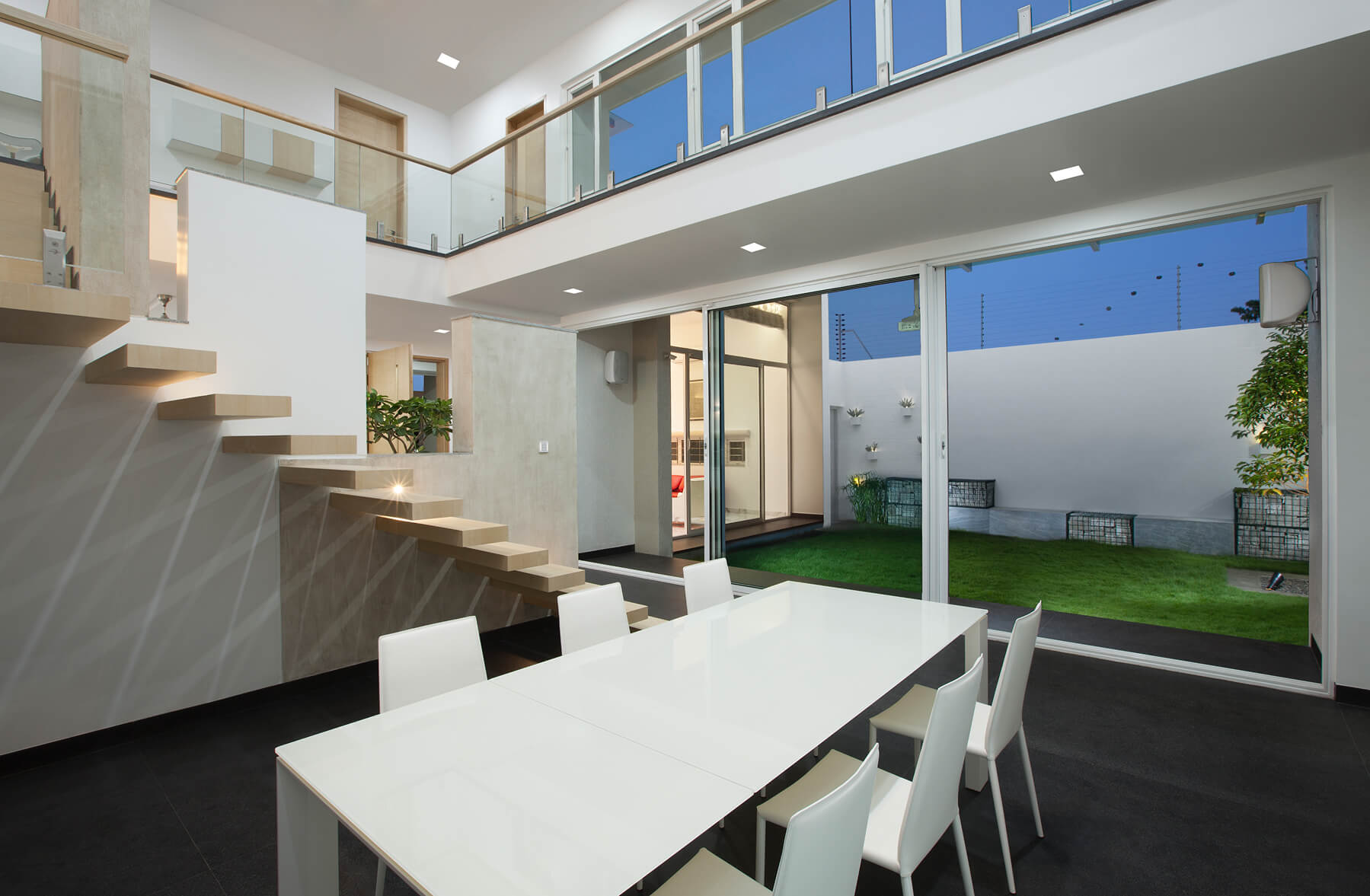 Entering through an off-centred verandah amidst a Koi pond invigorates the haptic experience right from the beginning. Having an urban court helps create spillover spaces that contribute to the dynamism embedded in the principle design ideology backing this residence. Having semi-private spaces like the dining room and the living room open into the courtyard creates a visual contrast throughout the house. Furthermore, the use of ceiling-to-floor windows both in the dining and the living room seamlessly merges the indoors with the courtyard to accommodate a wider range of activities.