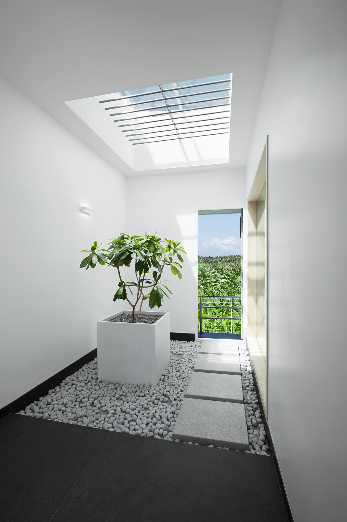 The interior finishes with white and grey as a primary palette create a seamless melancholy in spatial movement. The contrast of the smooth white walls with the black, riverbed frosted granite calls for curiosity within each space.