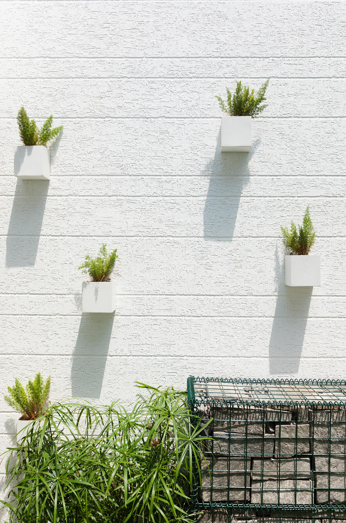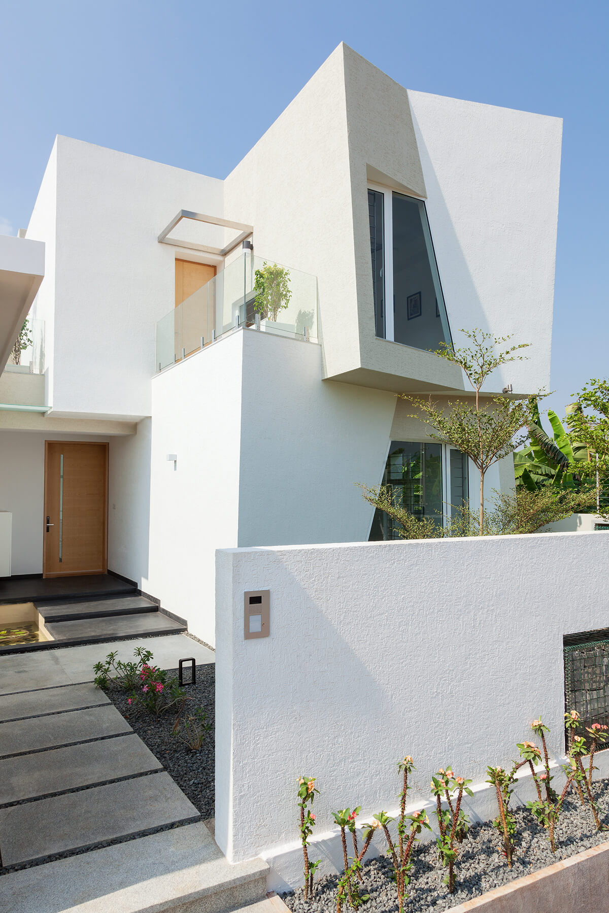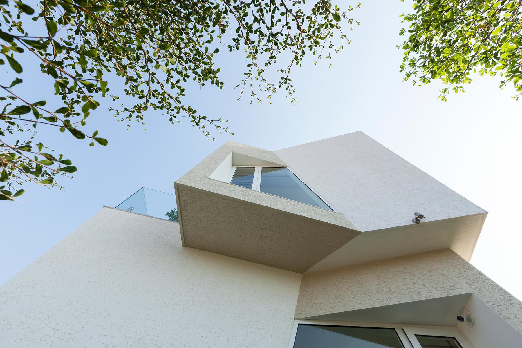 The exterior follows a similar approach to the sculptural minimalism followed by the indoors. The oblique parametric geometries in the façade not only act as decorative elements but prevent harsh sunlight from entering the house. The way light moves and reflects through the geometries presses the importance of form follows function, while the minimalistic approach lets the form shapeshift according to the ever-changing functions.