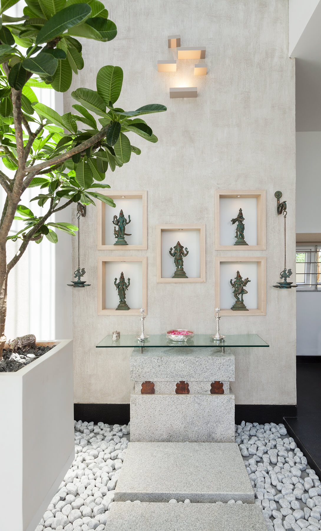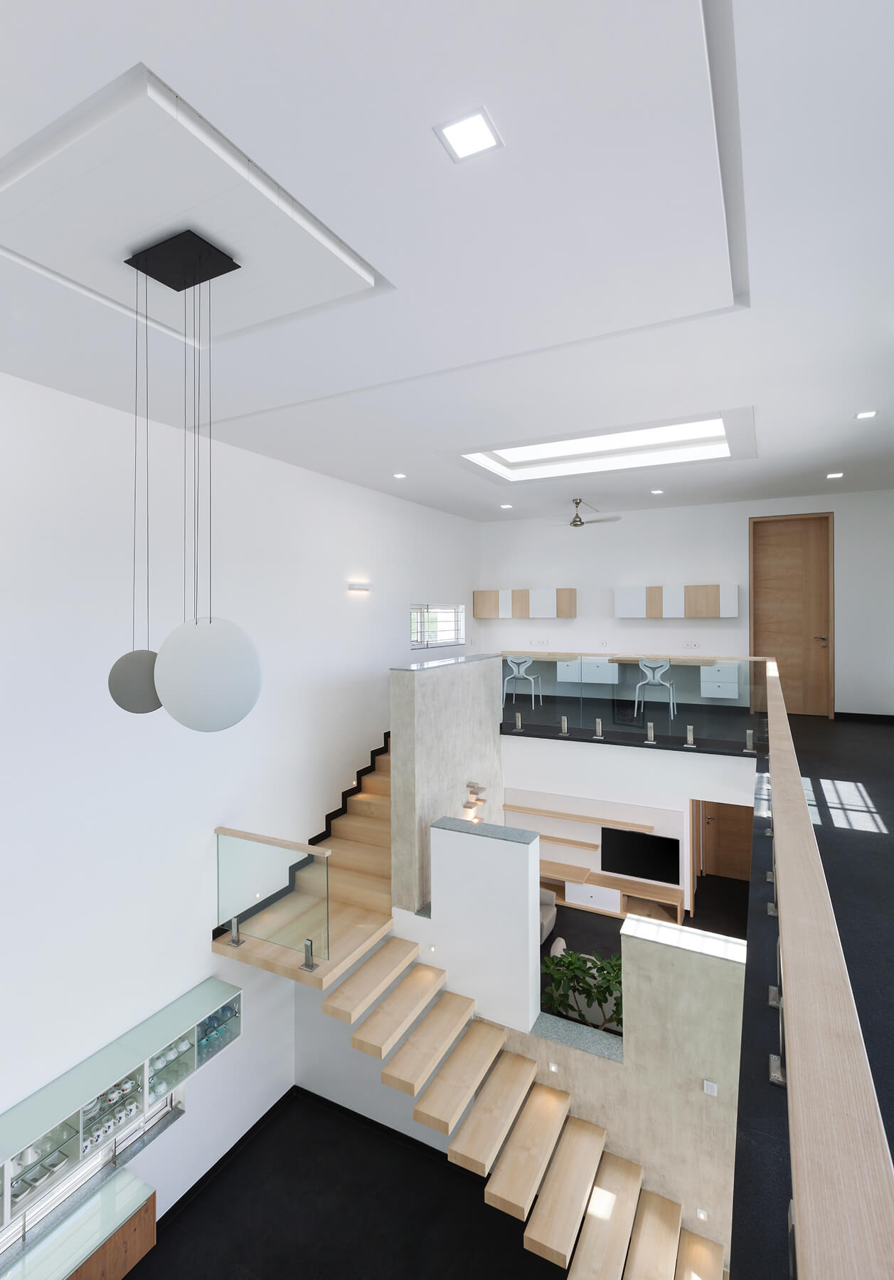 The floating staircase is showcased in a tasteful fashion with multiple viewpoints through different planes, as it reimagines architectural installation in a minimalistic sense. This feature is neighbored by a double-height pooja wall with a louvred skylight. The liminal spaces as one transcend up the staircase are used as a study: fabricating an open plan with constant interaction between various people performing various activities.