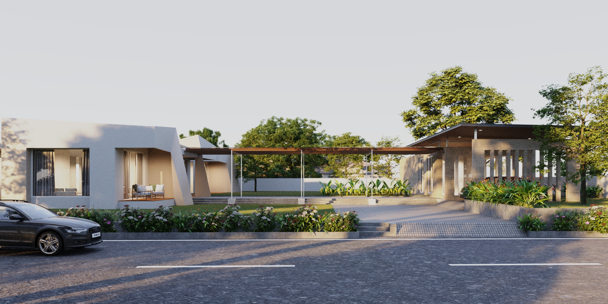 The Odyssey connects a cluster of parametric structures to a strictly modern and dense form with a covered walkway.
