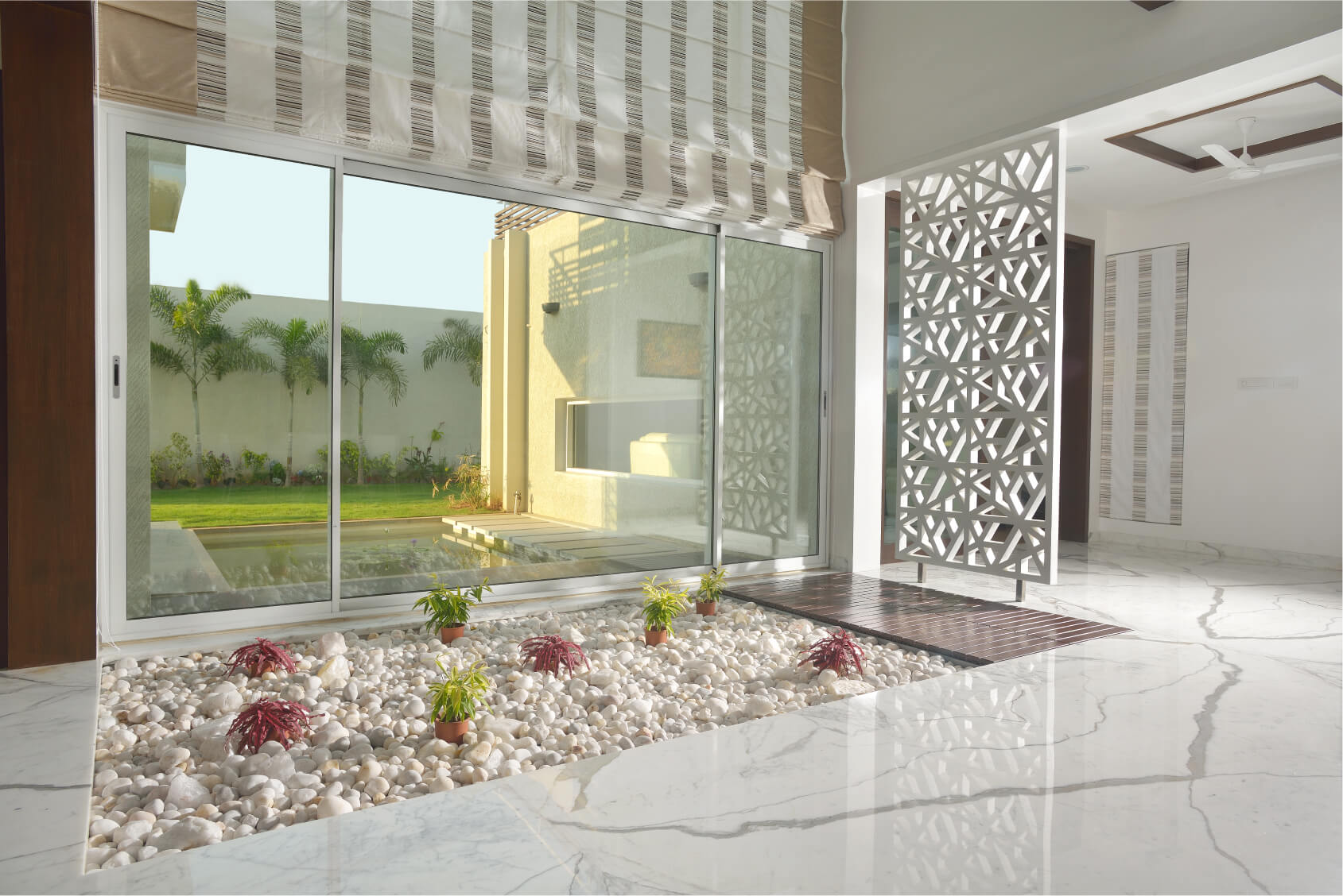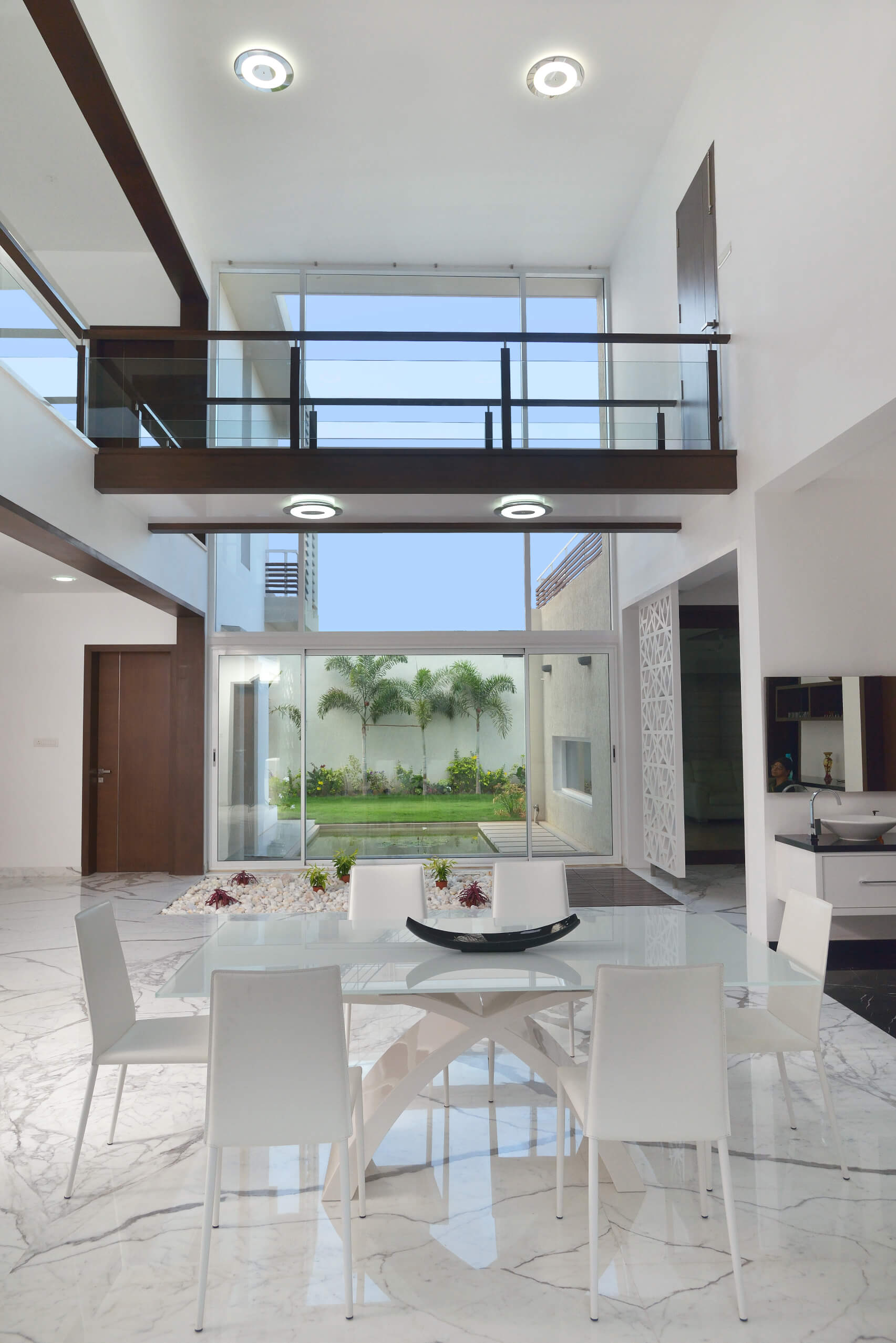 Entering through an off-centred verandah amidst a Koi pond invigorates the haptic experience right from the beginning. Having an urban court helps create spillover spaces that contribute to the dynamism embedded in the principle design ideology backing this residence. Having semi-private spaces like the dining room and the living room open into the courtyard creates a visual contrast throughout the house. Furthermore, the use of ceiling-to-floor windows both in the dining and the living room seamlessly merges the indoors with the courtyard to accommodate a wider range of activities.