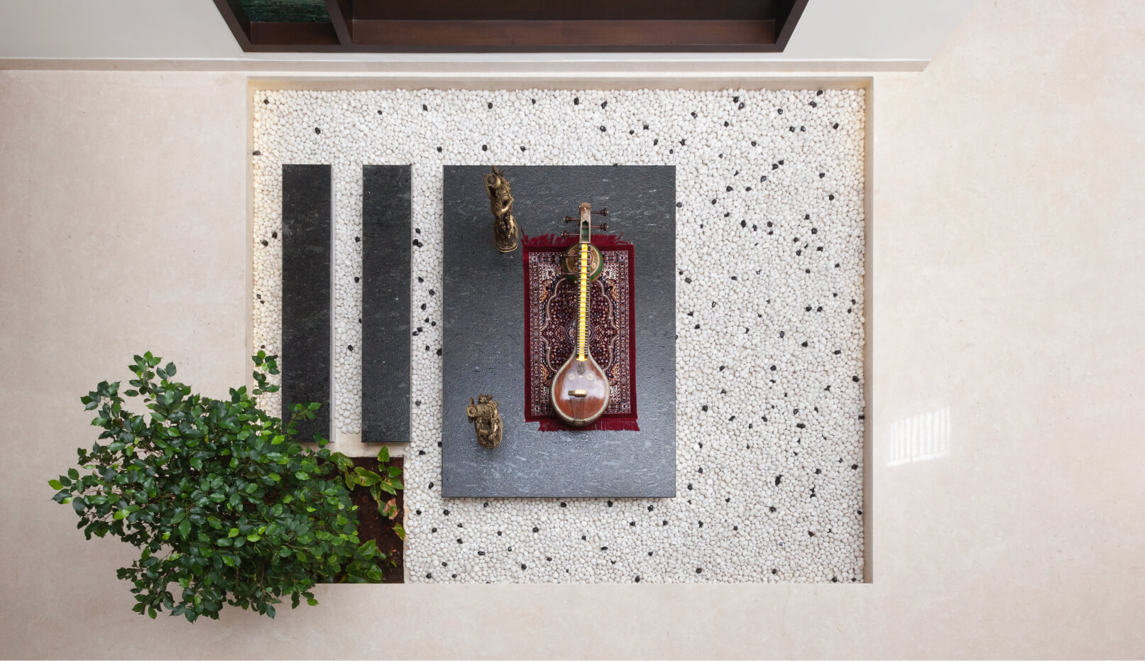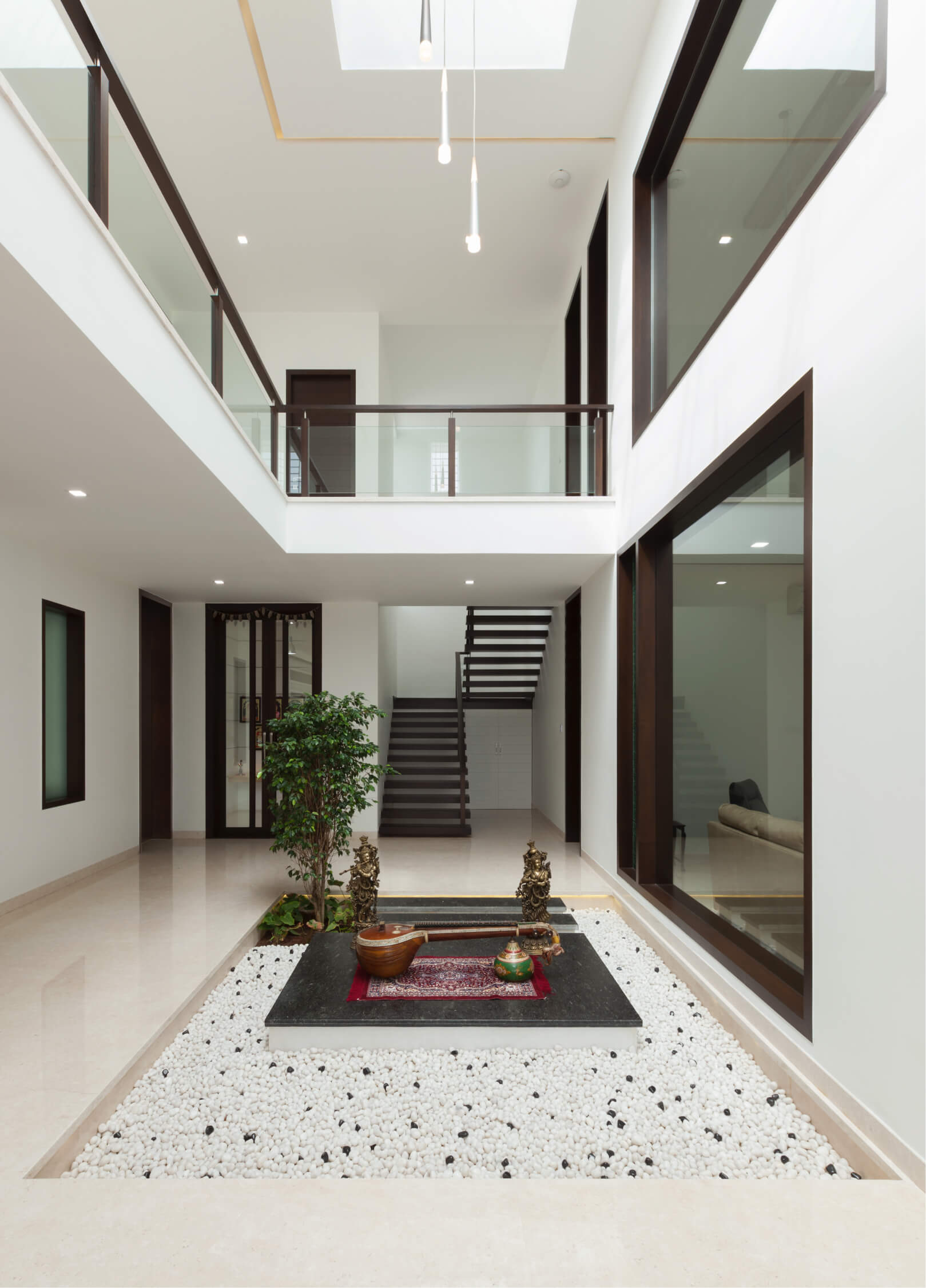 The floating staircase is showcased in a tasteful fashion with multiple viewpoints through different planes, as it reimagines architectural installation in a minimalistic sense. This feature is neighbored by a double-height pooja wall with a louvred skylight. The liminal spaces as one transcend up the staircase are used as a study: fabricating an open plan with constant interaction between various people performing various activities.