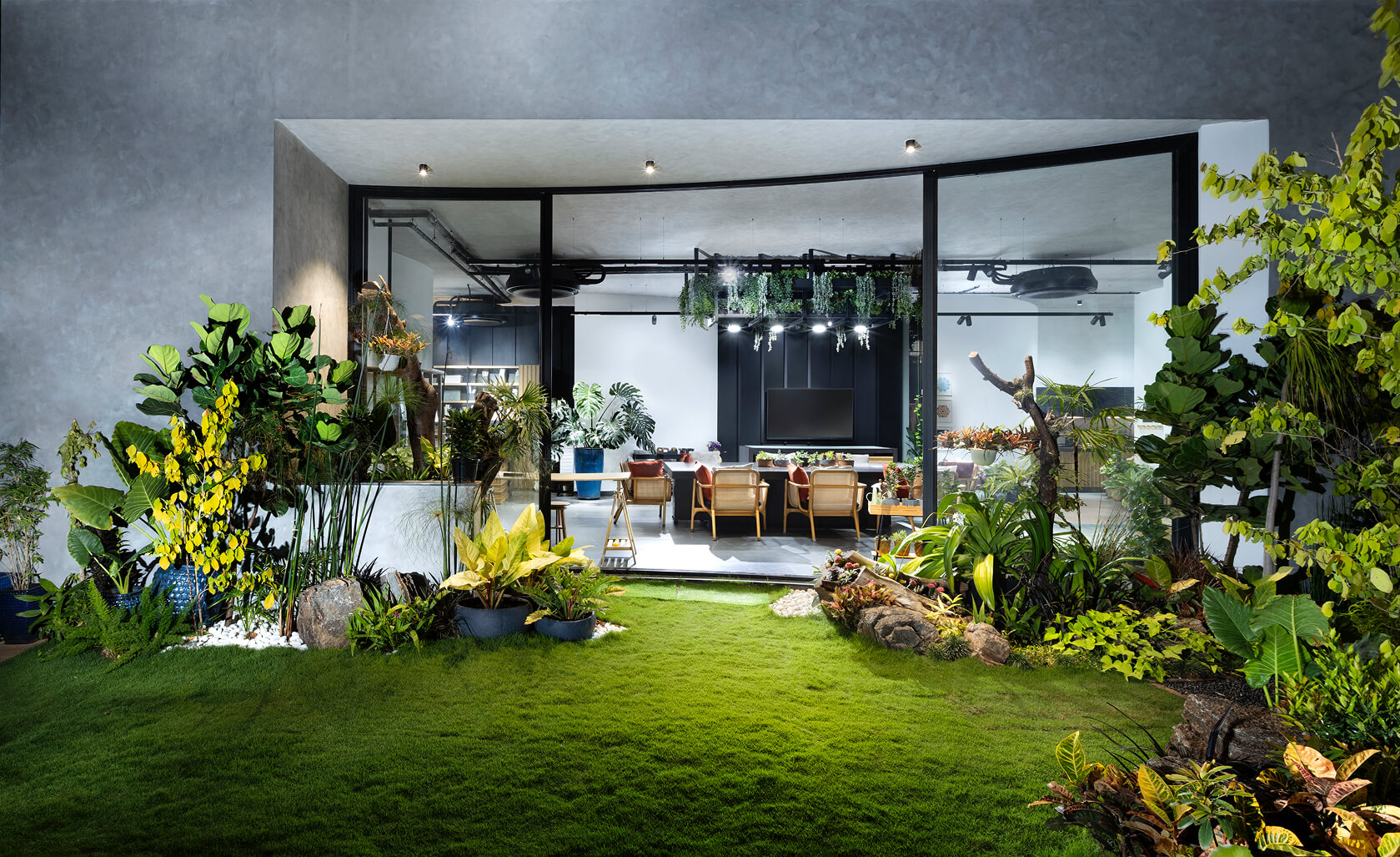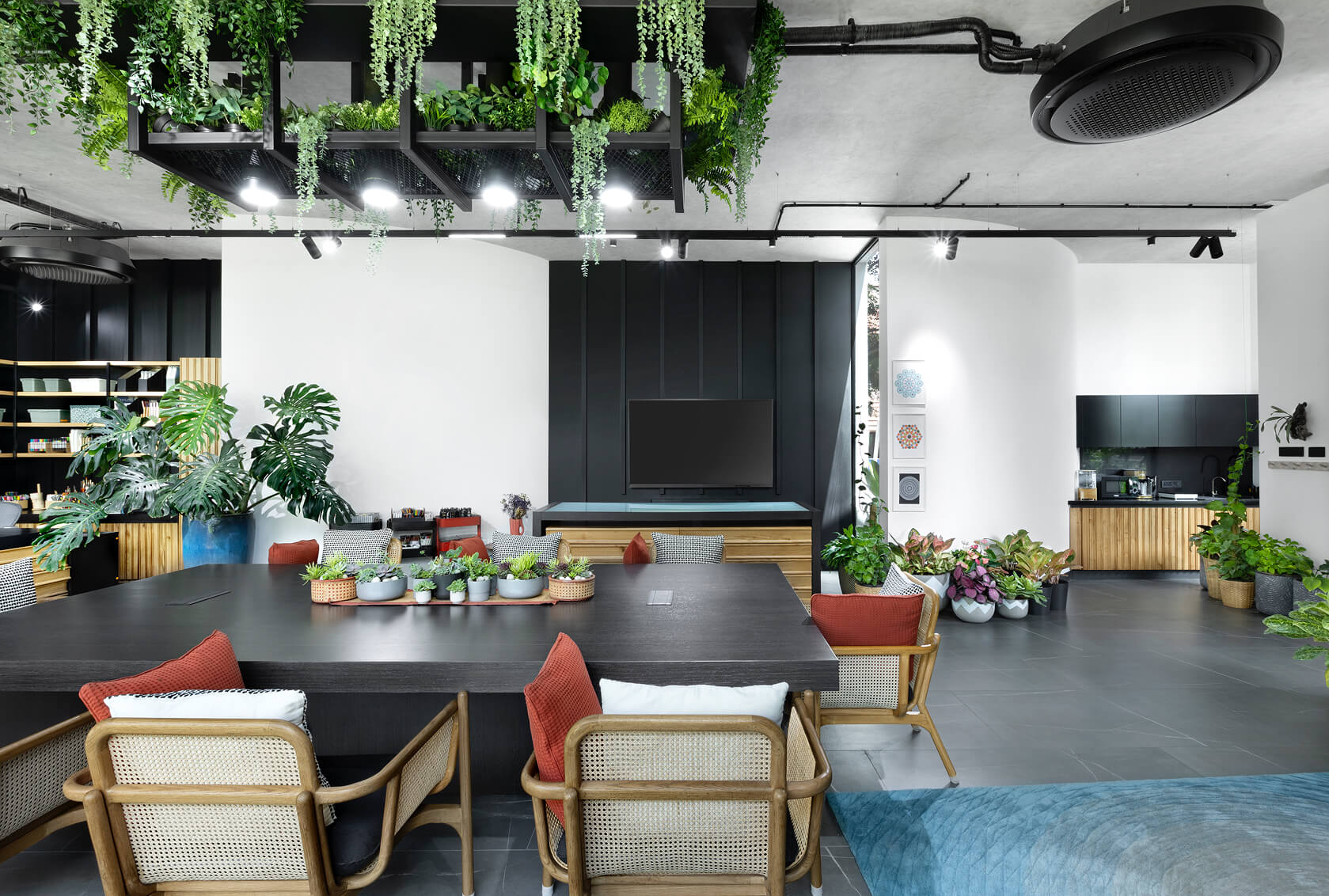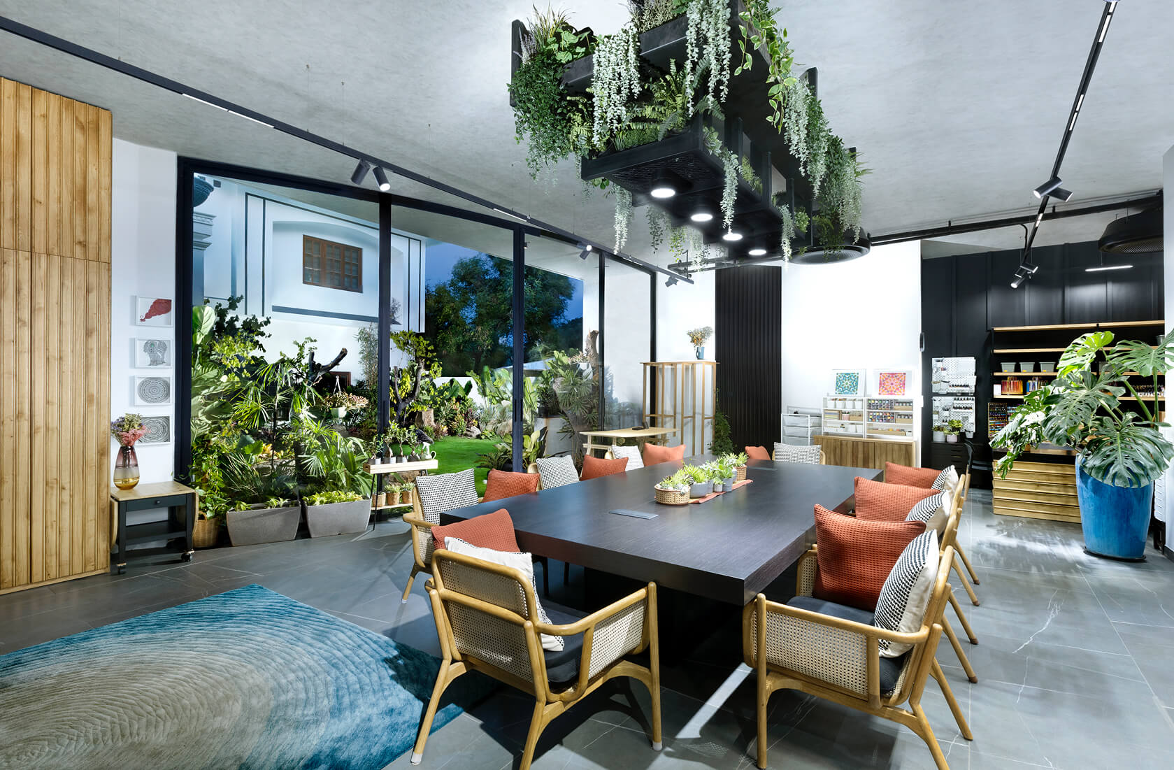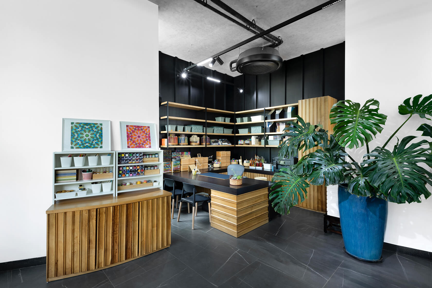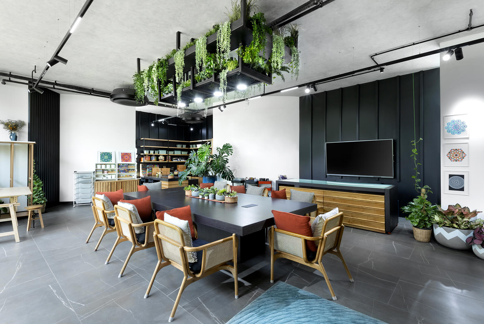 Contrasting shades of black, grey and white finishes are used in the interiors such as black PU paint finish for the walls; American- white oak finish for the furniture; grey vitrified tiles for the flooring; and Archi-concrete finish for the ceiling. This creates a neutral background for the art and the dwellers while letting the space be highlighted. These design iterations foster a pleasant environment for workshops, performance arts, and viewing galleries.