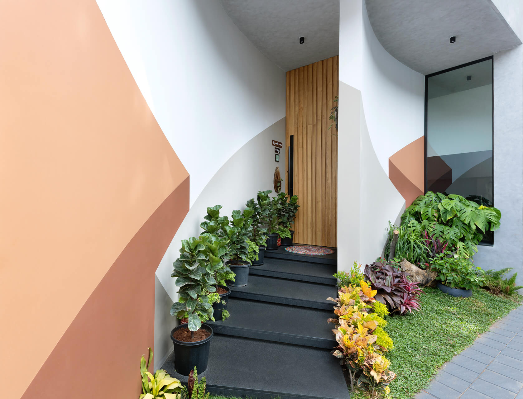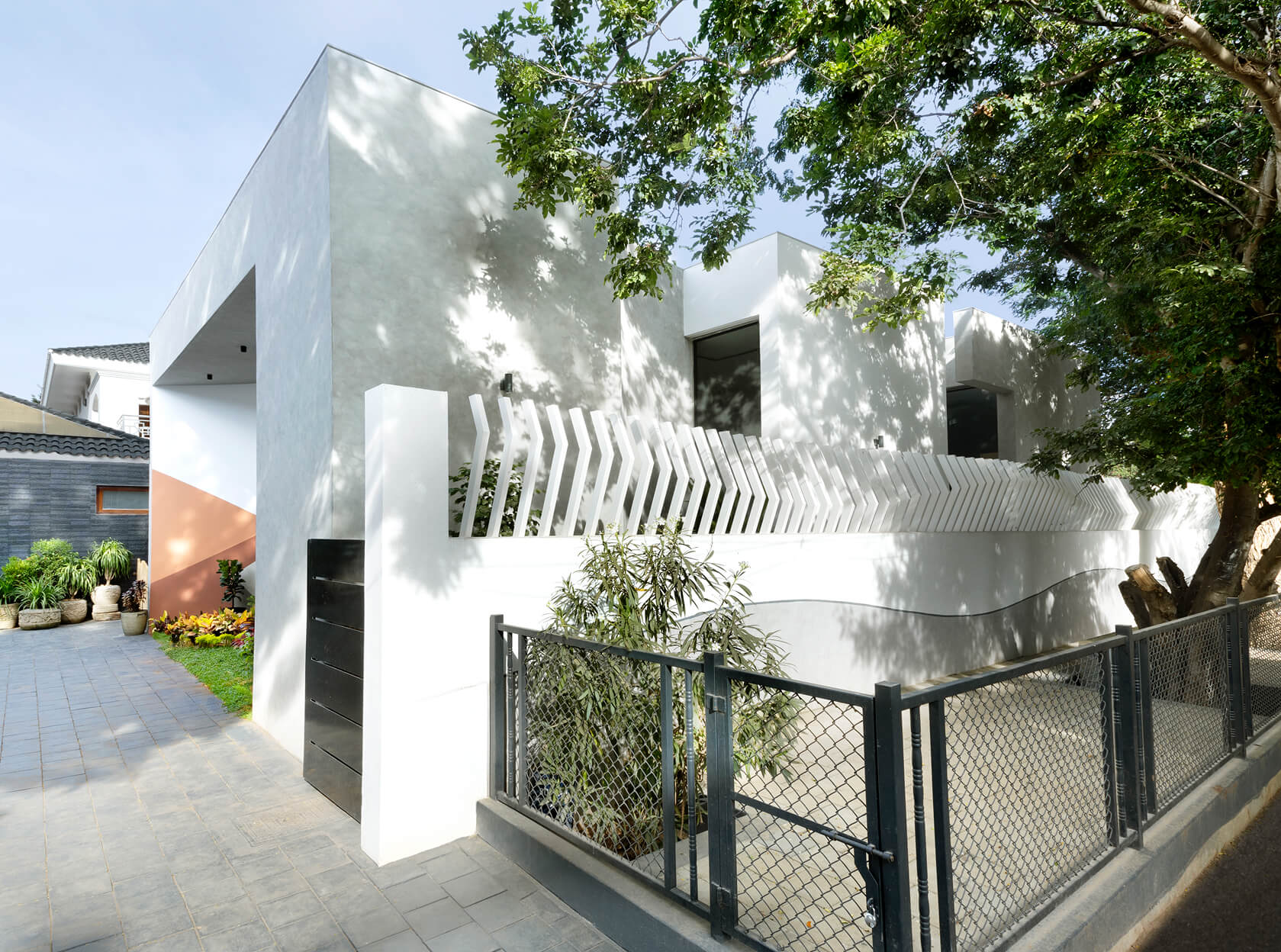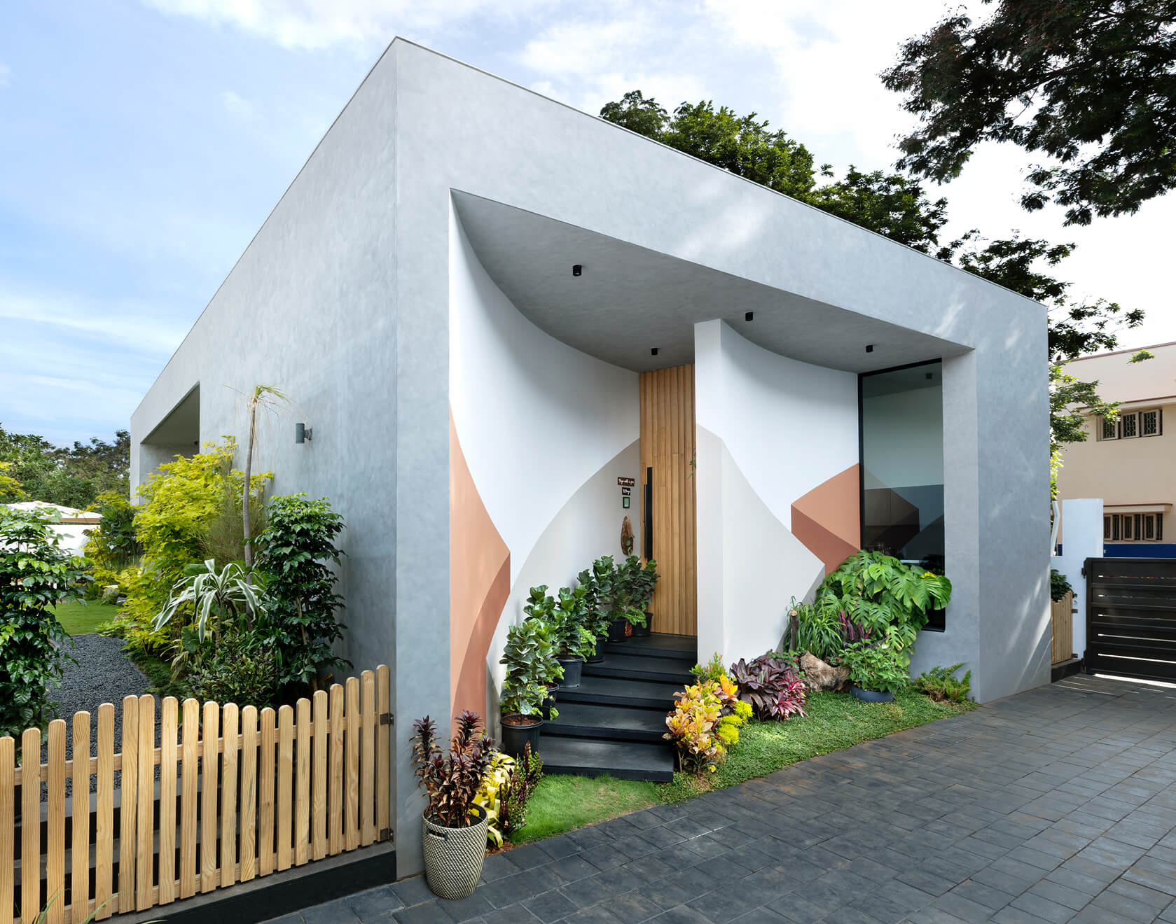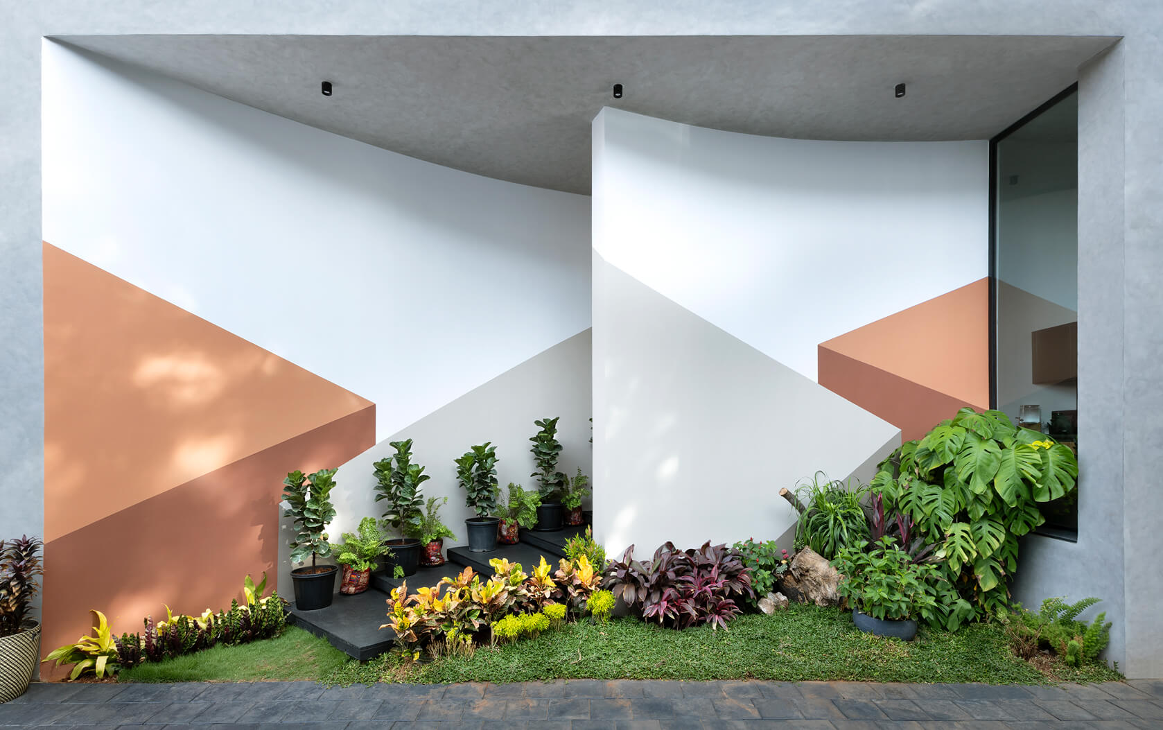 Located in the urban fringe of Coimbatore, Pod of Canvas acts as a social art space that promotes a creative environment for its city dwellers. Situated on a simple flat rectangular site of around 2300 sq.ft (60’0”x38’6”), this private atelier is designed to be an intimate haven for an artist seeking a retreat from the hustle and bustle of everyday life. Primary geometries around the site inspired the form of the studio. The gallery confines within a cubical boundary while the carved-out curves create a visual and functional parallax. The curvilinear panels used on the facade allow for the inhabitants to navigate the tailored spaces inside and nurture a sense of directionality.