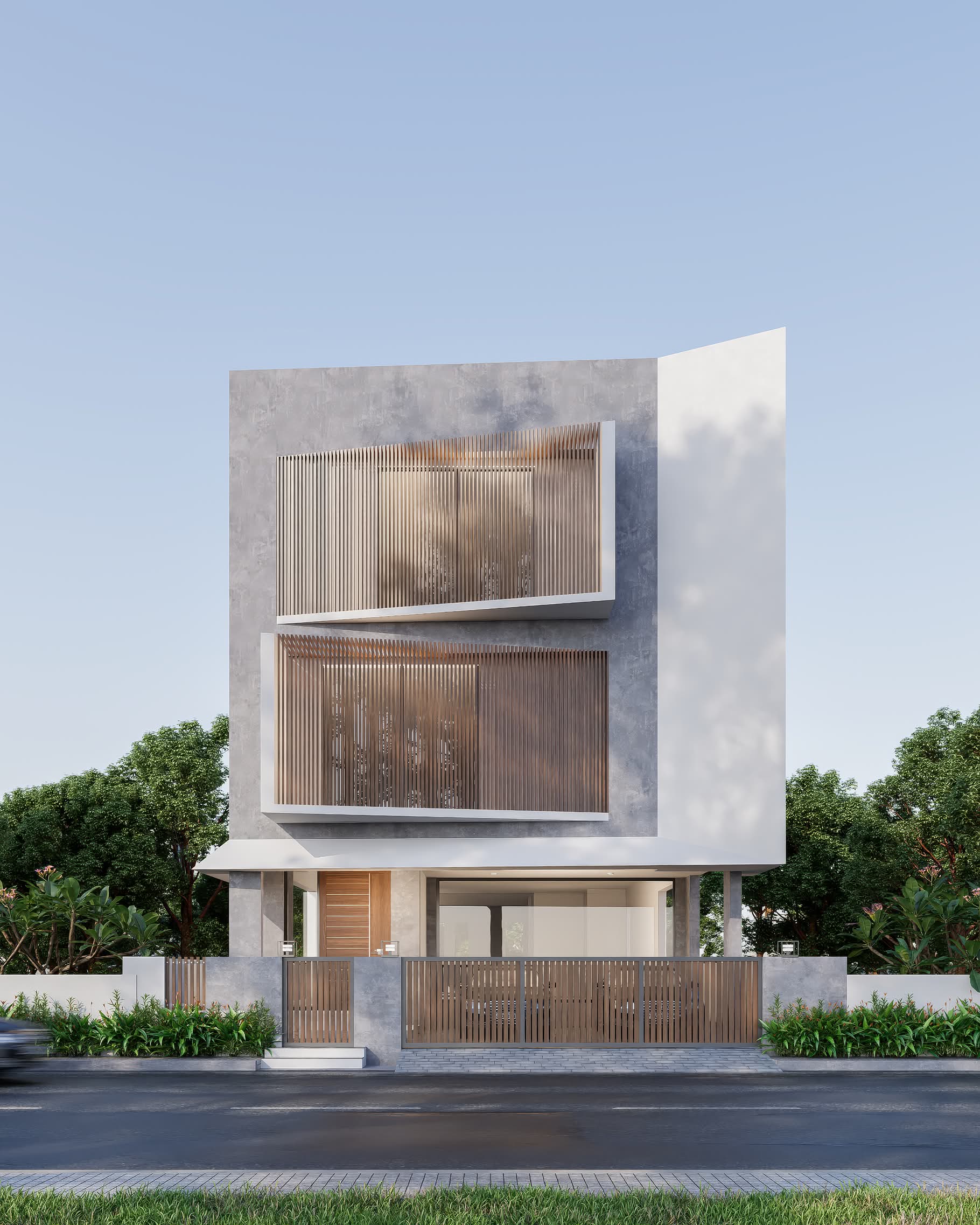 The complementary parallel slants formed by the windows are a key element in the facade. Multi-planar bents on the corners hint at a subtle parametric parallax in the envelope.