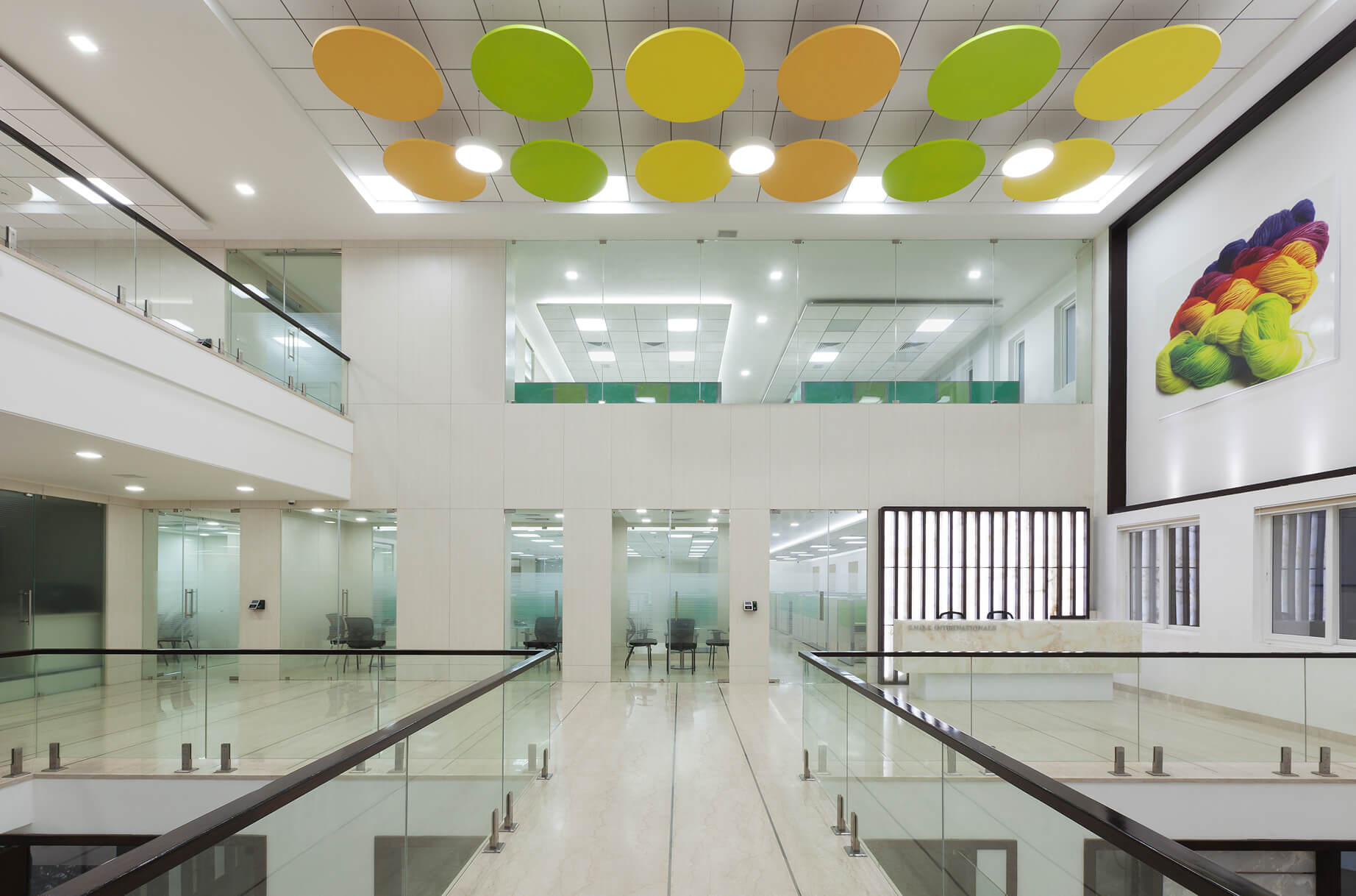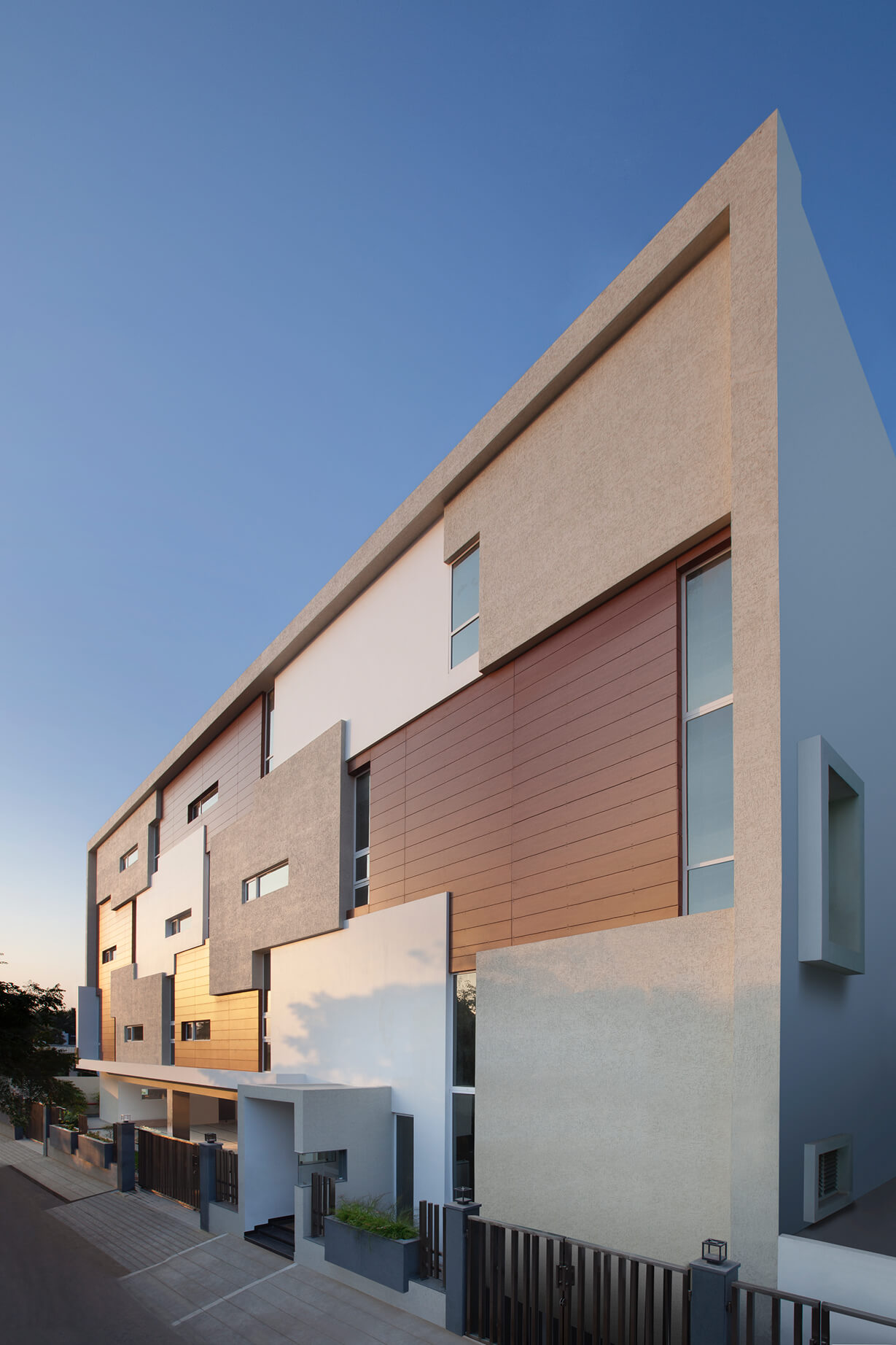 This corporate office for a garments export company is designed to let a multi-storey atrium connect the interior volumes across various floors. Visual elements of vibrant colours symbolise the textile trade, bringing liveliness to an otherwise monotonous workspace. The layering of subtly complementing materials is carefully placed to mark the dynamic façade. The uplights in the night edifies the meticulously designed elevation. The partially permeable compound visually blocks the movement in the stilt level, creating a pocket of privacy.