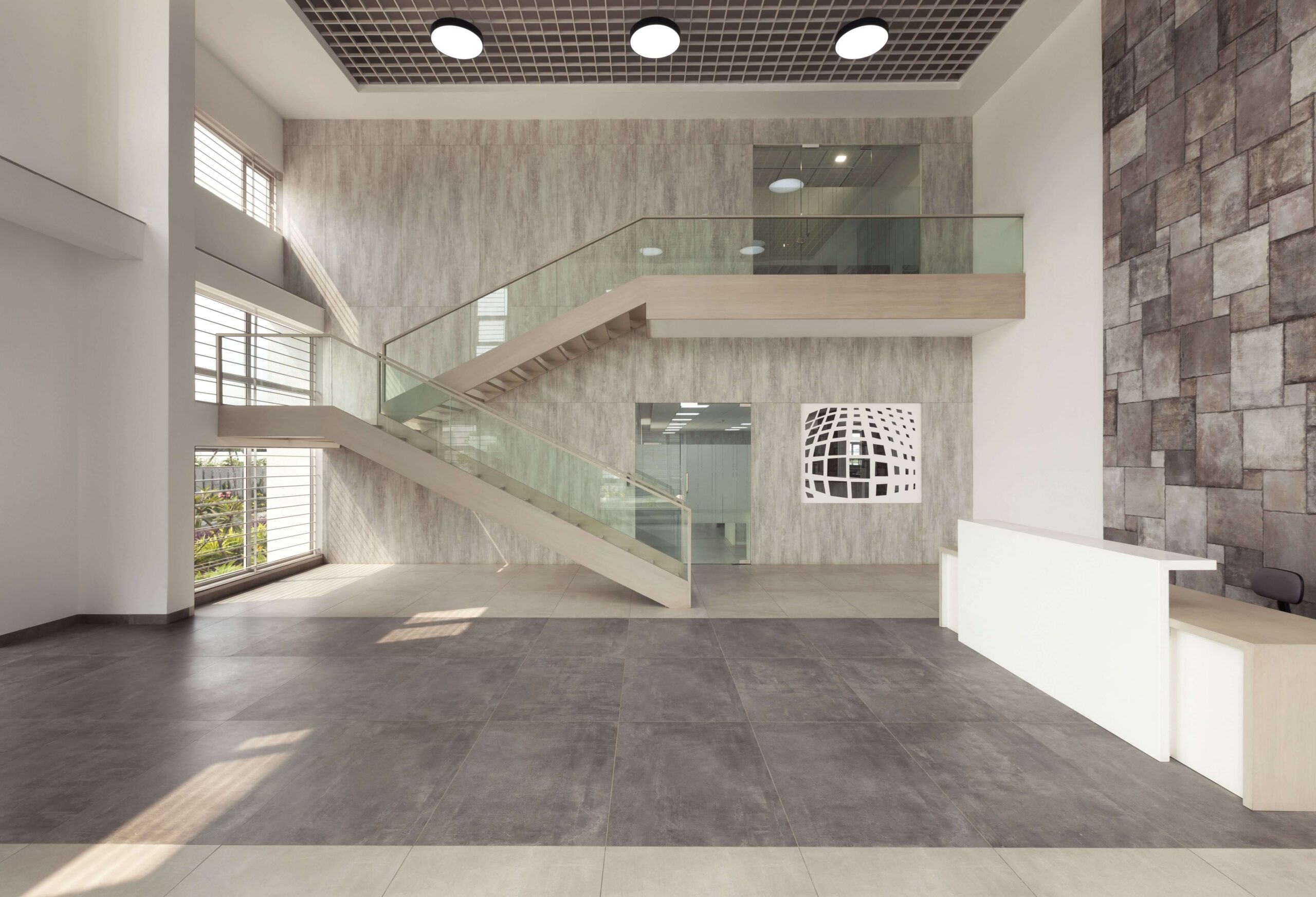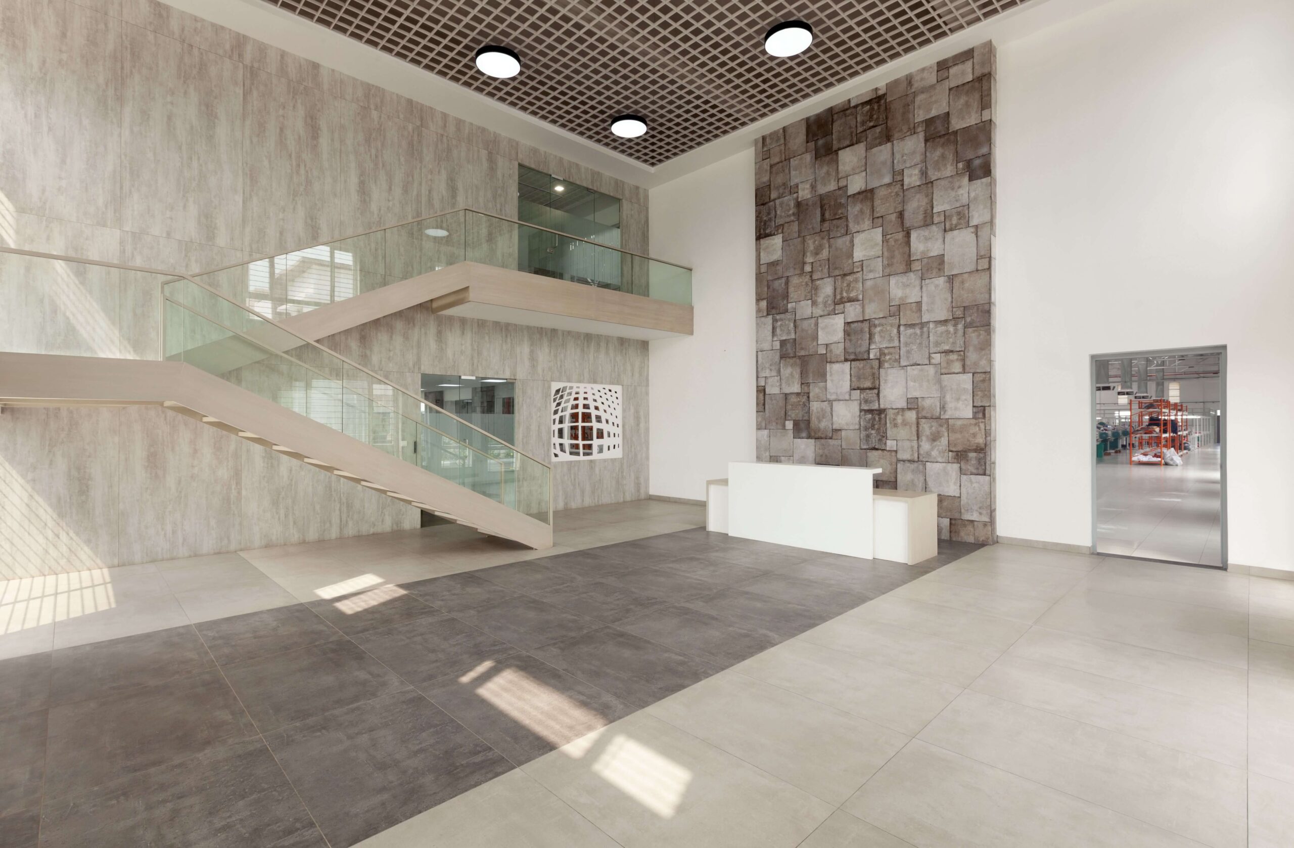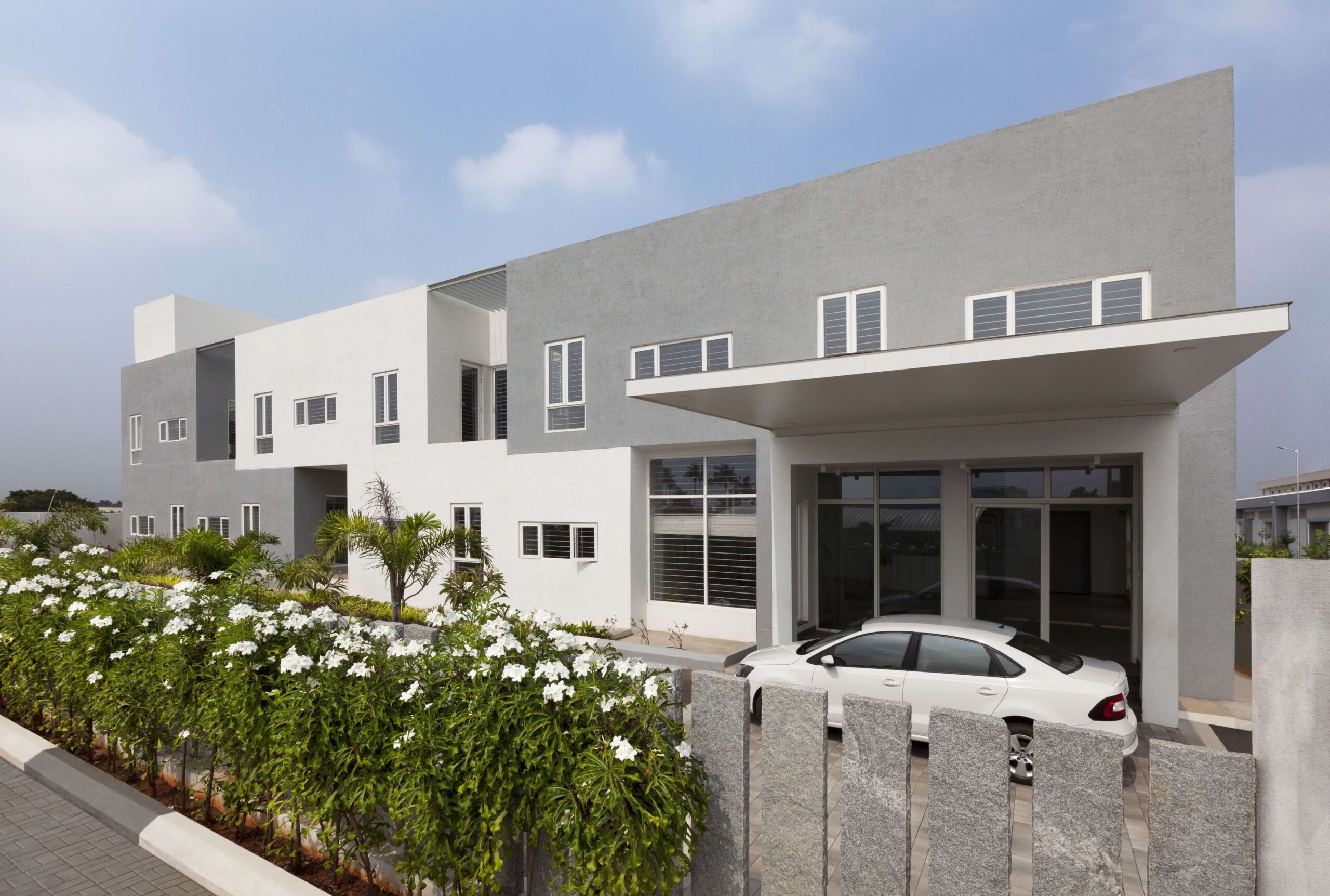 A clothing manufacturing unit that is finished with grey and white stucco paint is situated in the industrial town of Erode. The facade is a repeating module of louvred terraces and solid blocks with ample windows for natural ventilation. The reception and lobby are designed as a shared double-height space with large openings to boast the grandeur of the business. Likewise, the peripheries of the mass buildup are accentuated with vegetation to liven up the modern industrial setting.