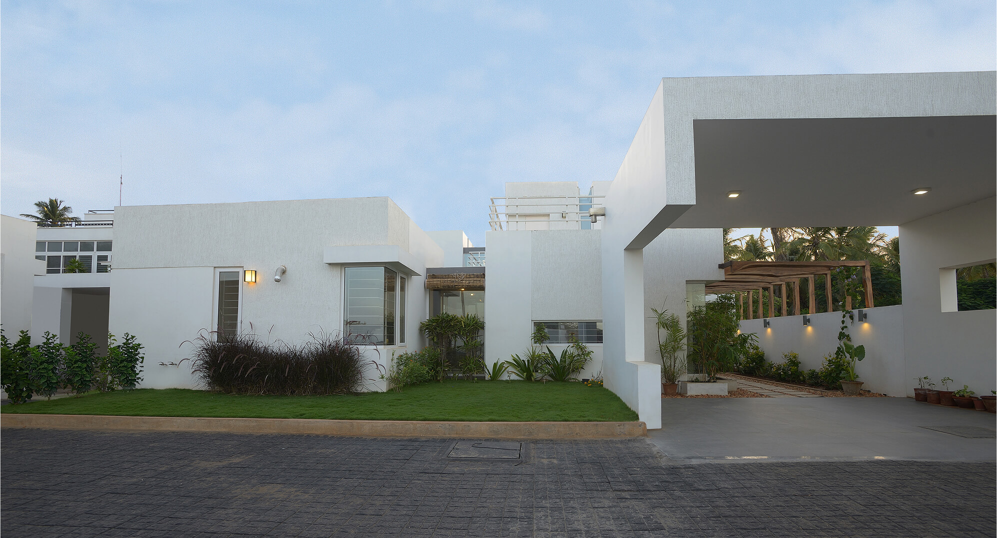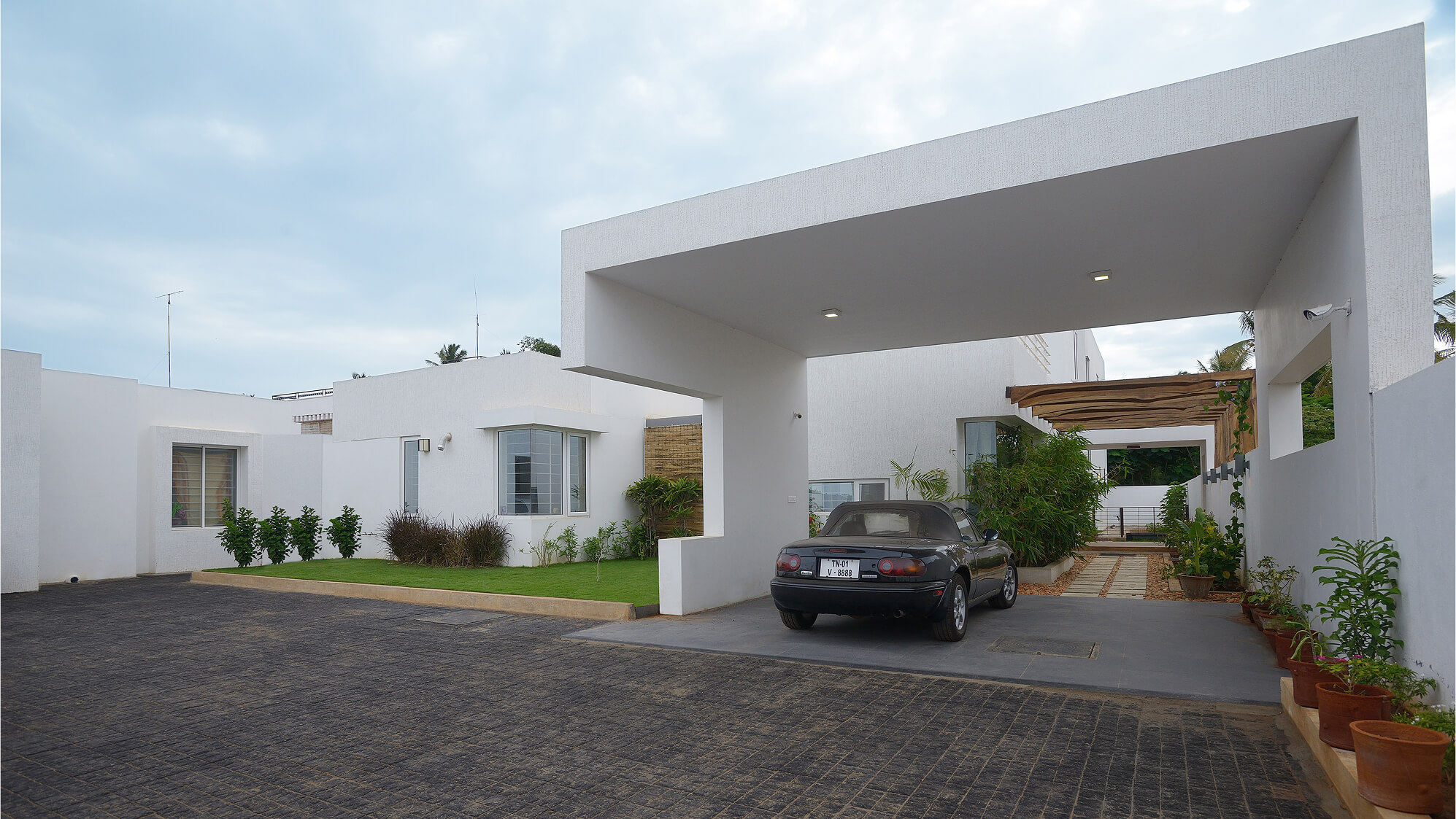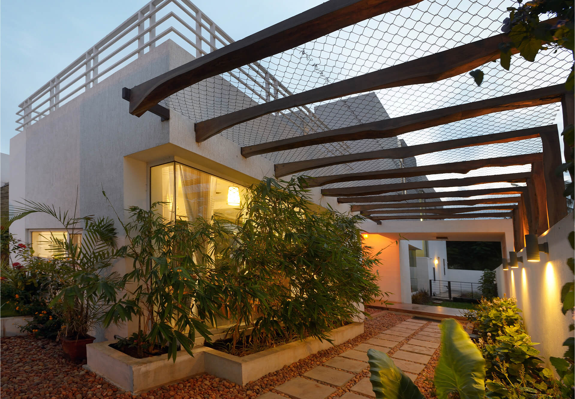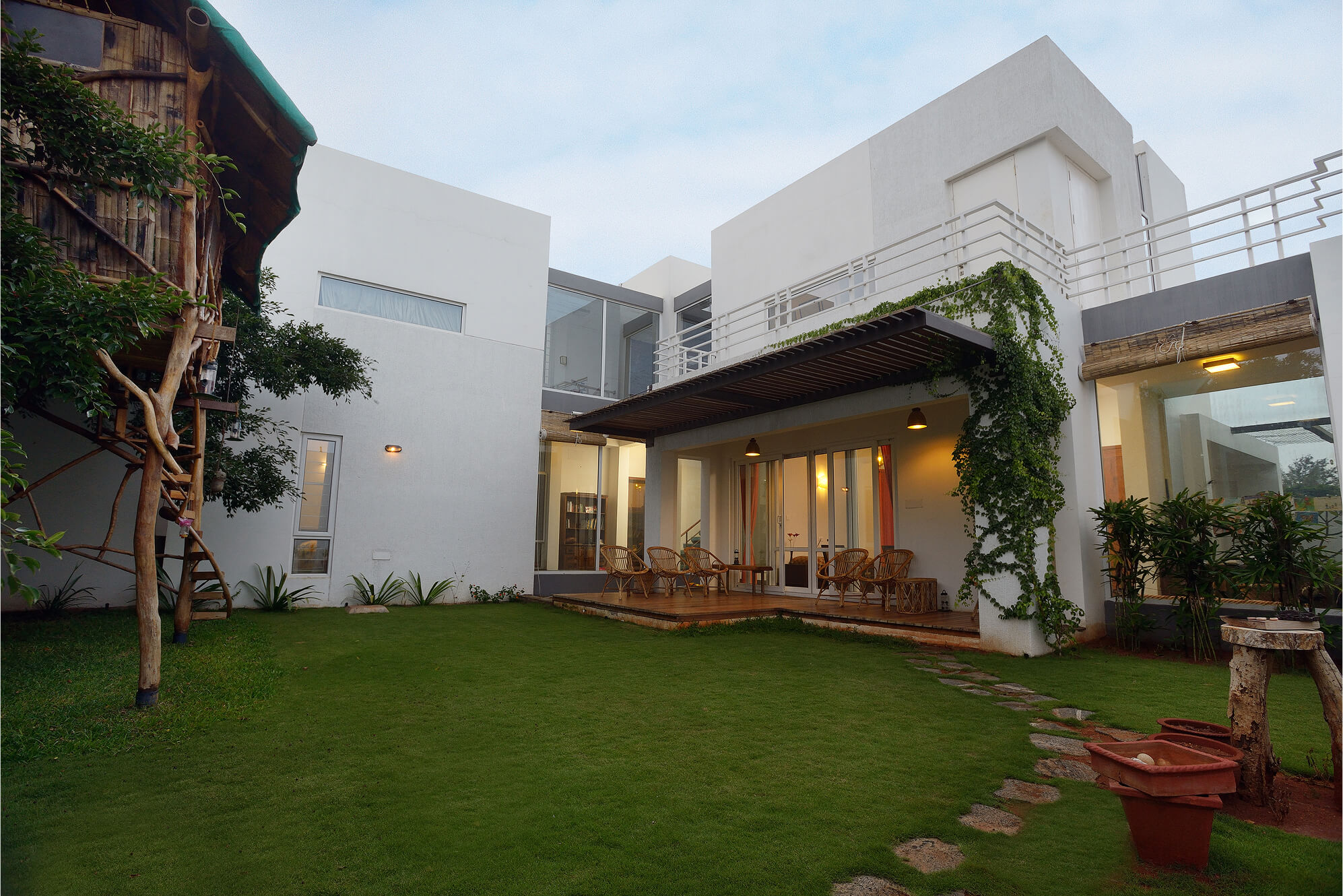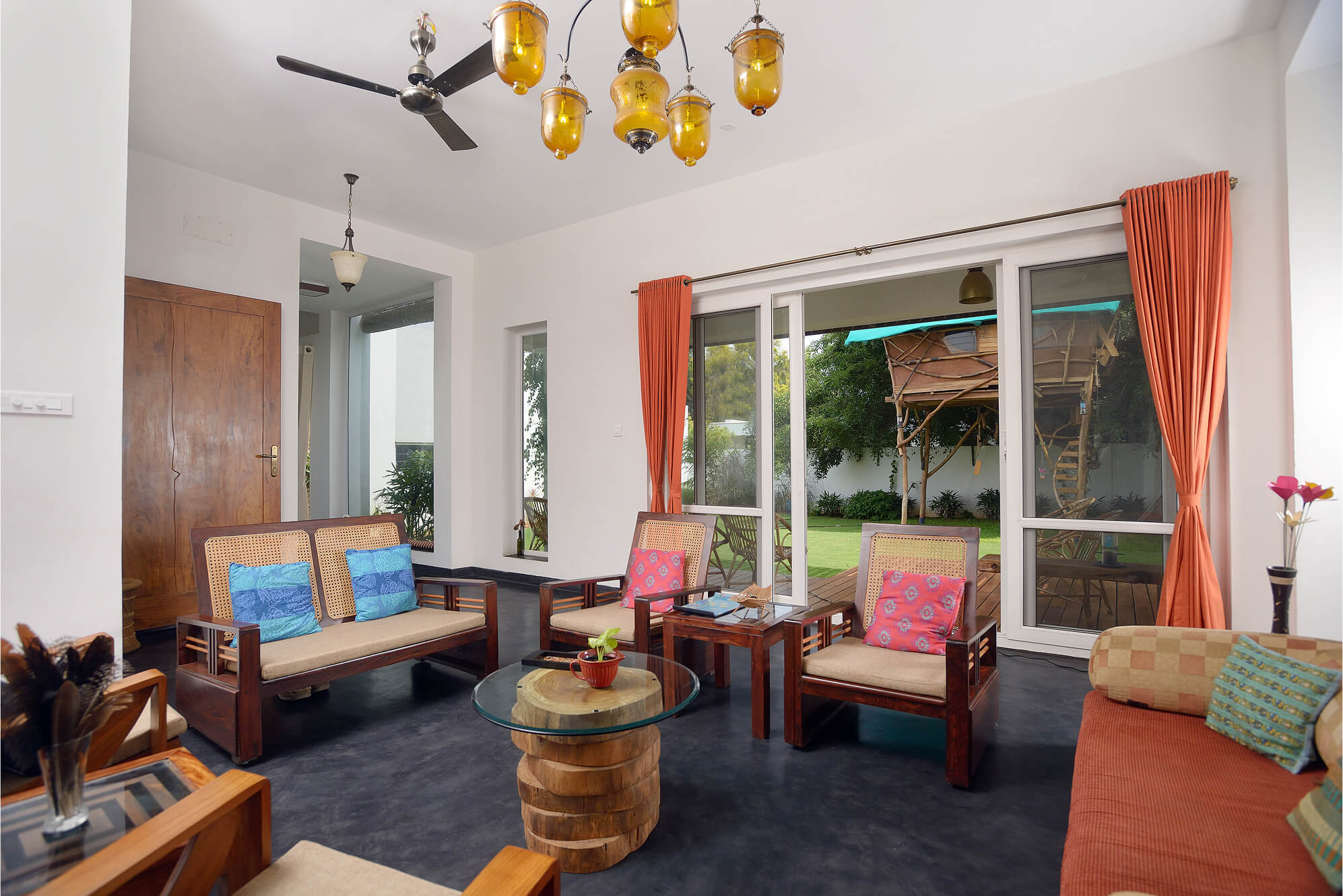 Being located in the urban hinterland of Coimbatore, this residence is a product of architectural experimentation: A scaled-up working model of a maquette. Simply by glueing together multiple volumes with the prerequisite of a central garden and a treehouse, the form was visualised. Most of the spaces on the ground floor have a private courtyard that invites natural ventilation. Having an eye for detail, the corners of each cubical volume are emphasized by carving out large openings. This not only creates an intriguing space but also brings the outdoors inside in an interesting way. The colourful and rustic interiors juxtapose the exteriors to create a riveting design language. Moreover, the colours and patterns are emphasized with the use of polished concrete flooring.