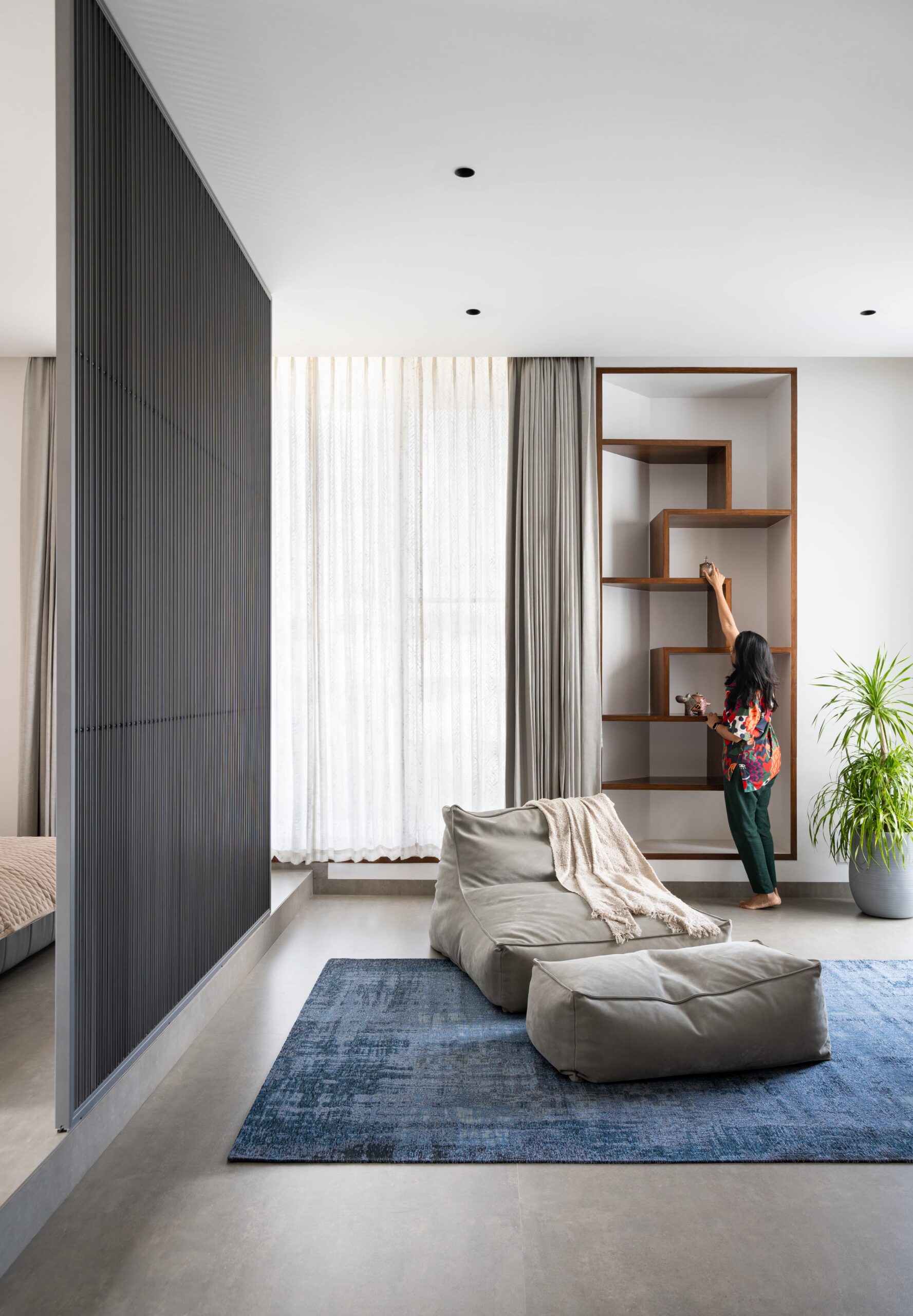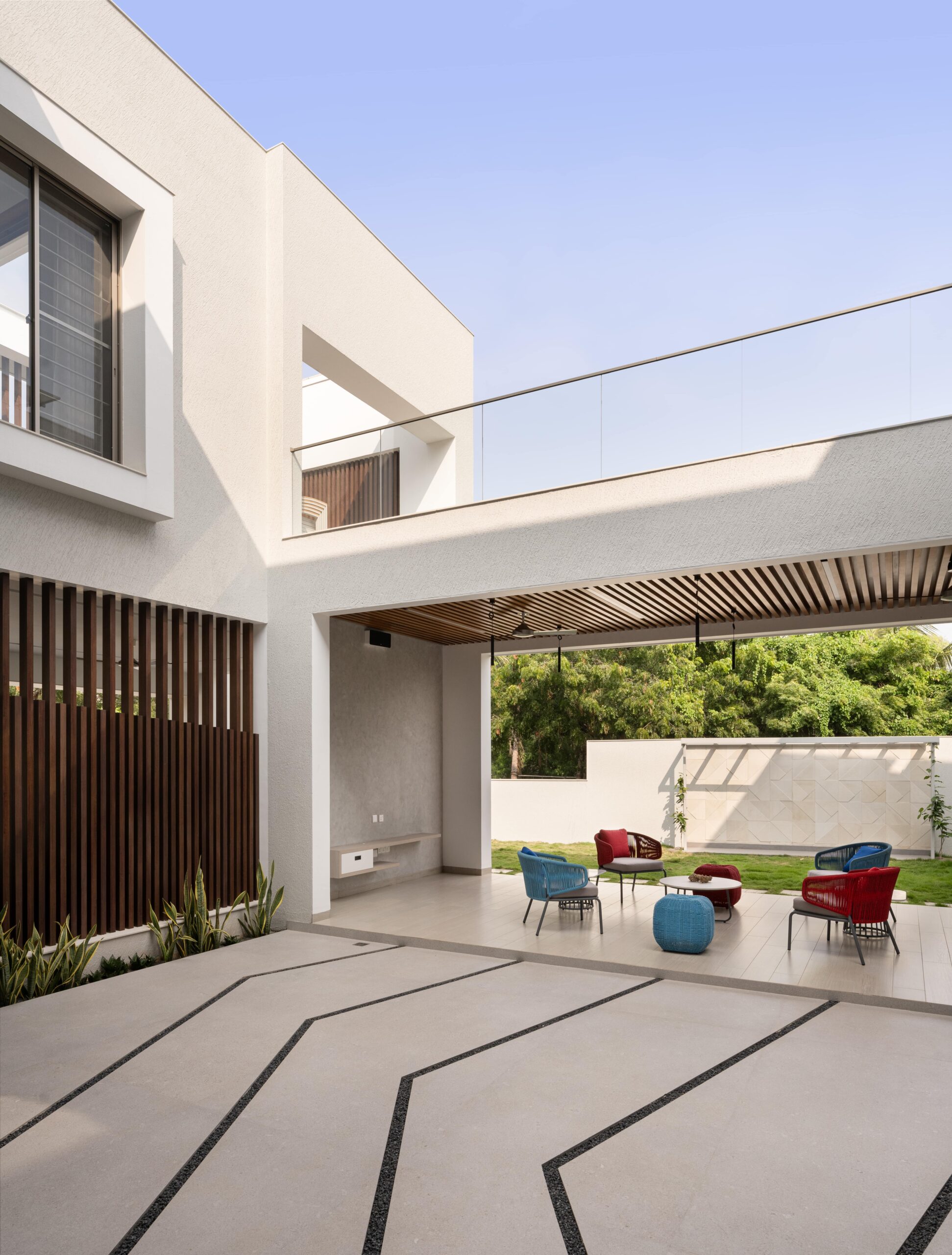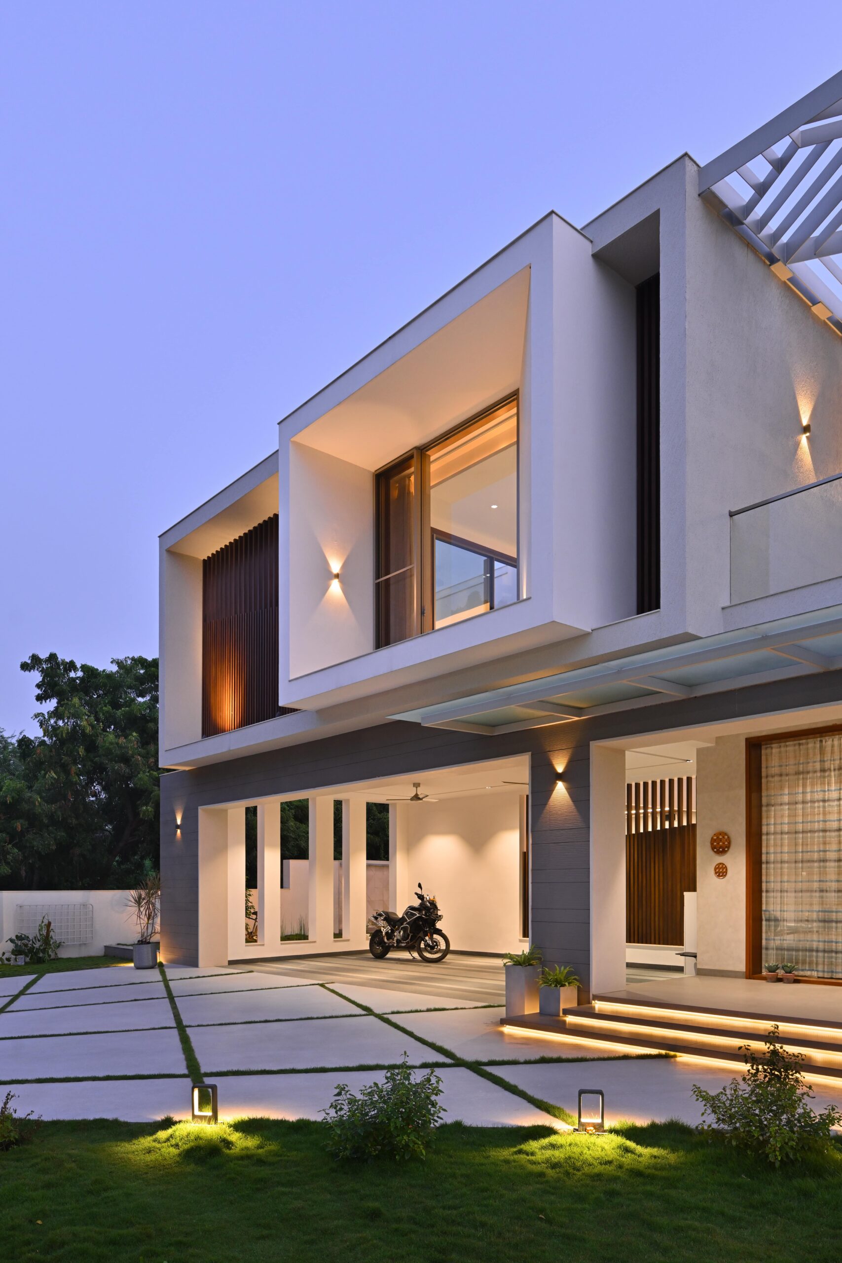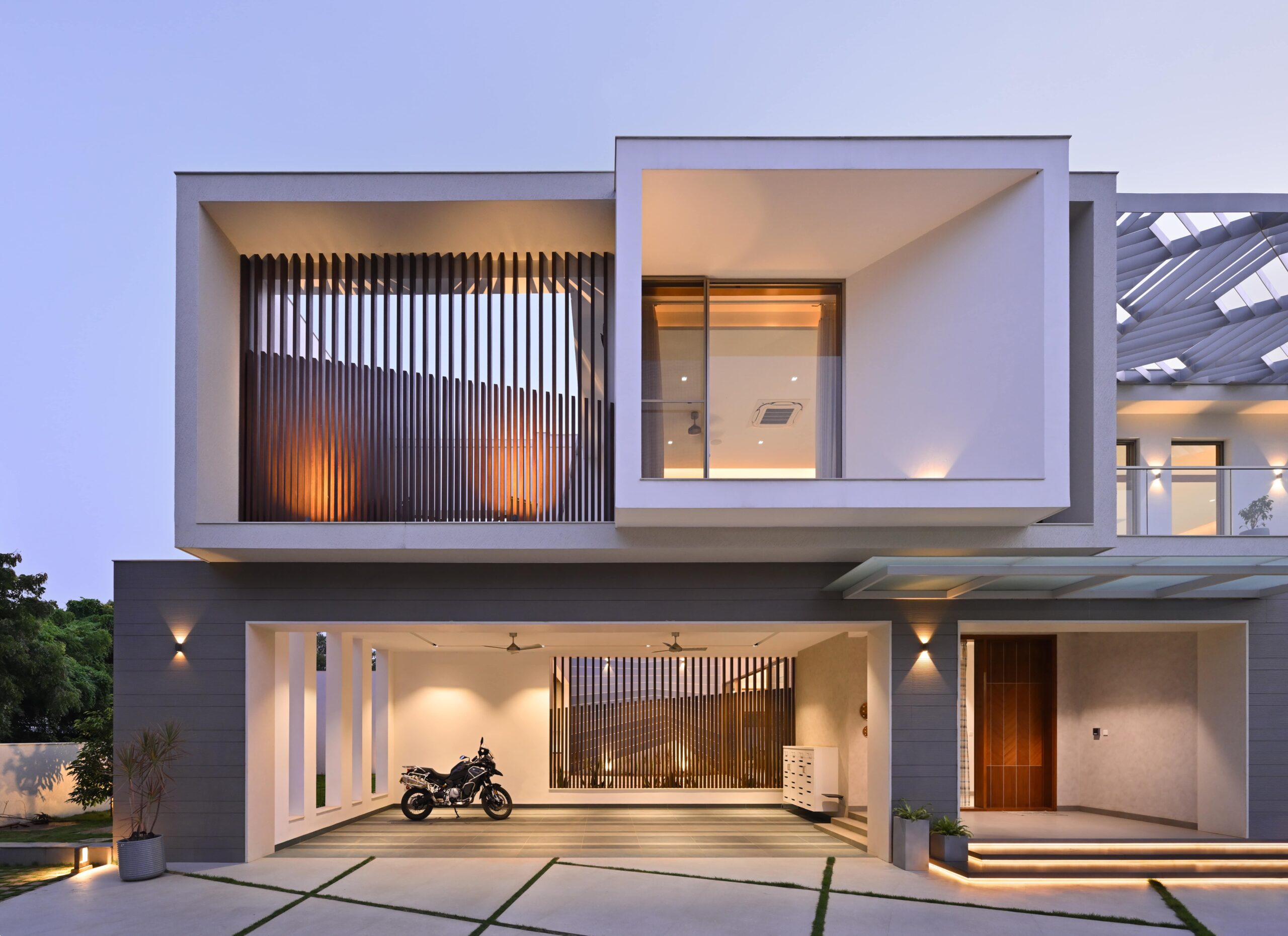 The form is carved from a box to create shaded terraces, overlooking balconies, and French windows that respond to the site’s verdure. The delicate steel pergola intrigues, allowing the white shell to stand out. Articulation of rooms is Vastu-compliant, emphasizing the pivotal role of light and ventilation inside. The foyer offers subtle glimpses of communal spaces, each portraying distinct character.