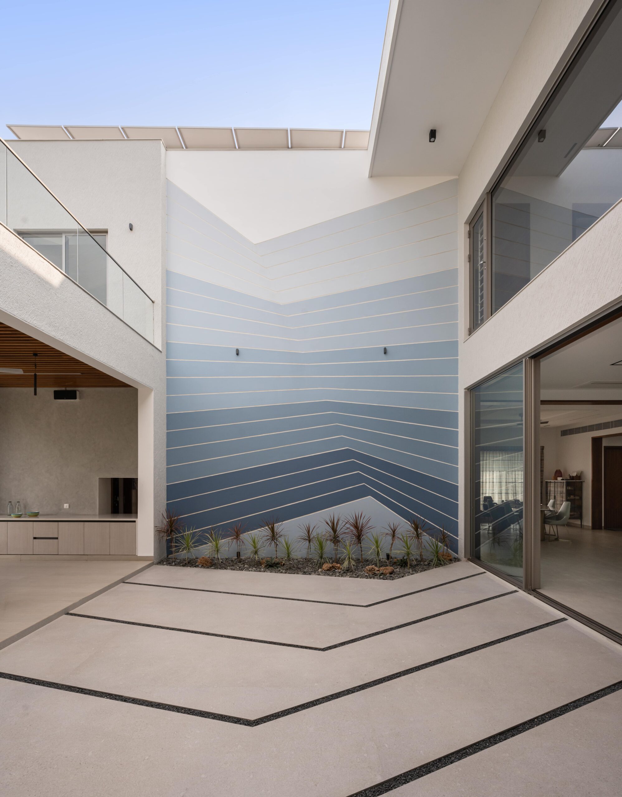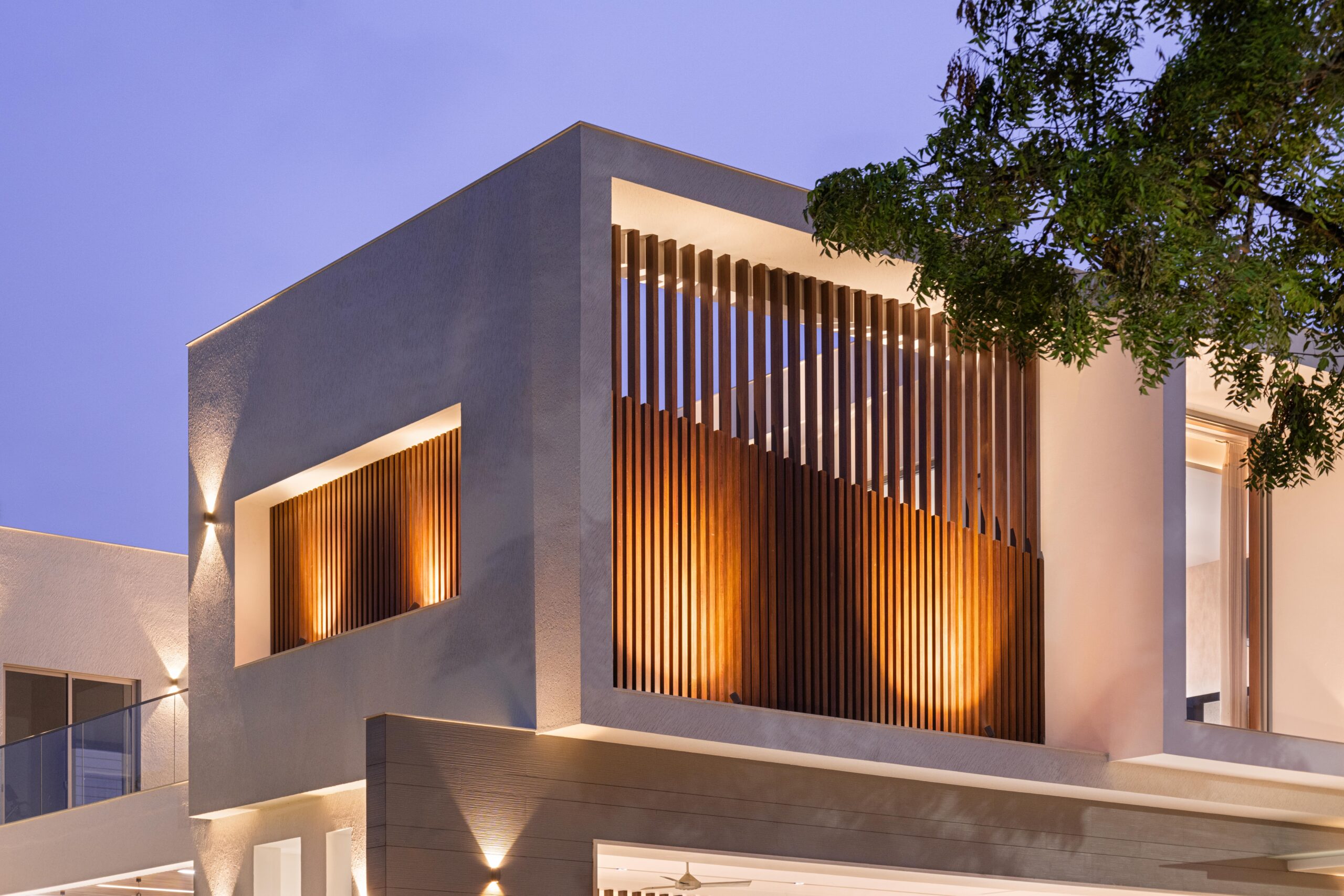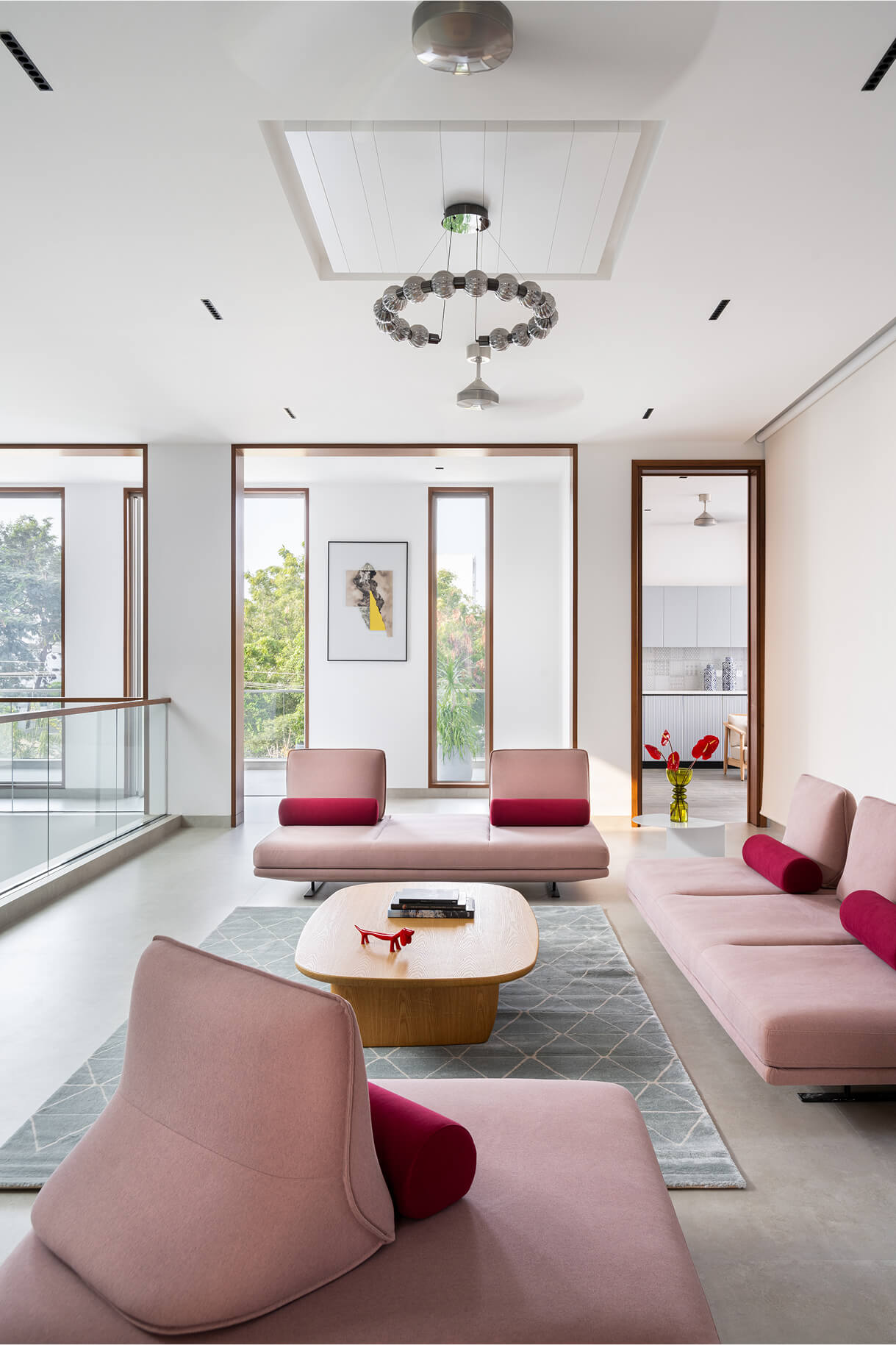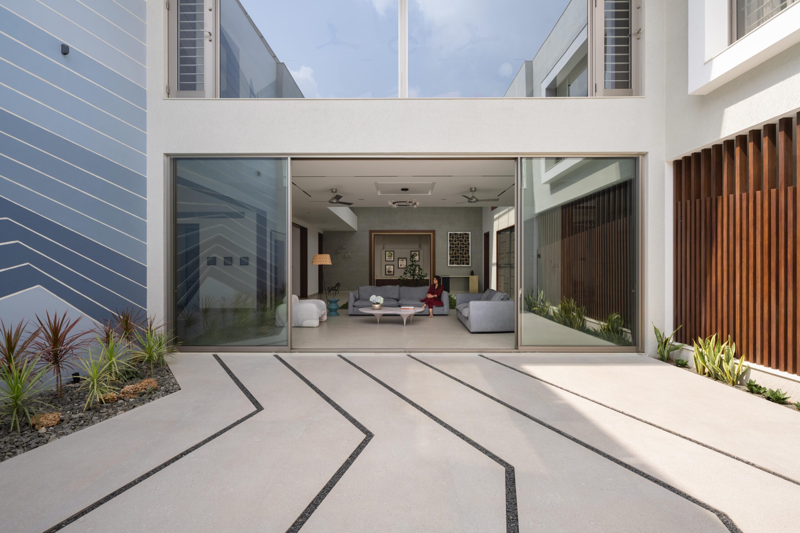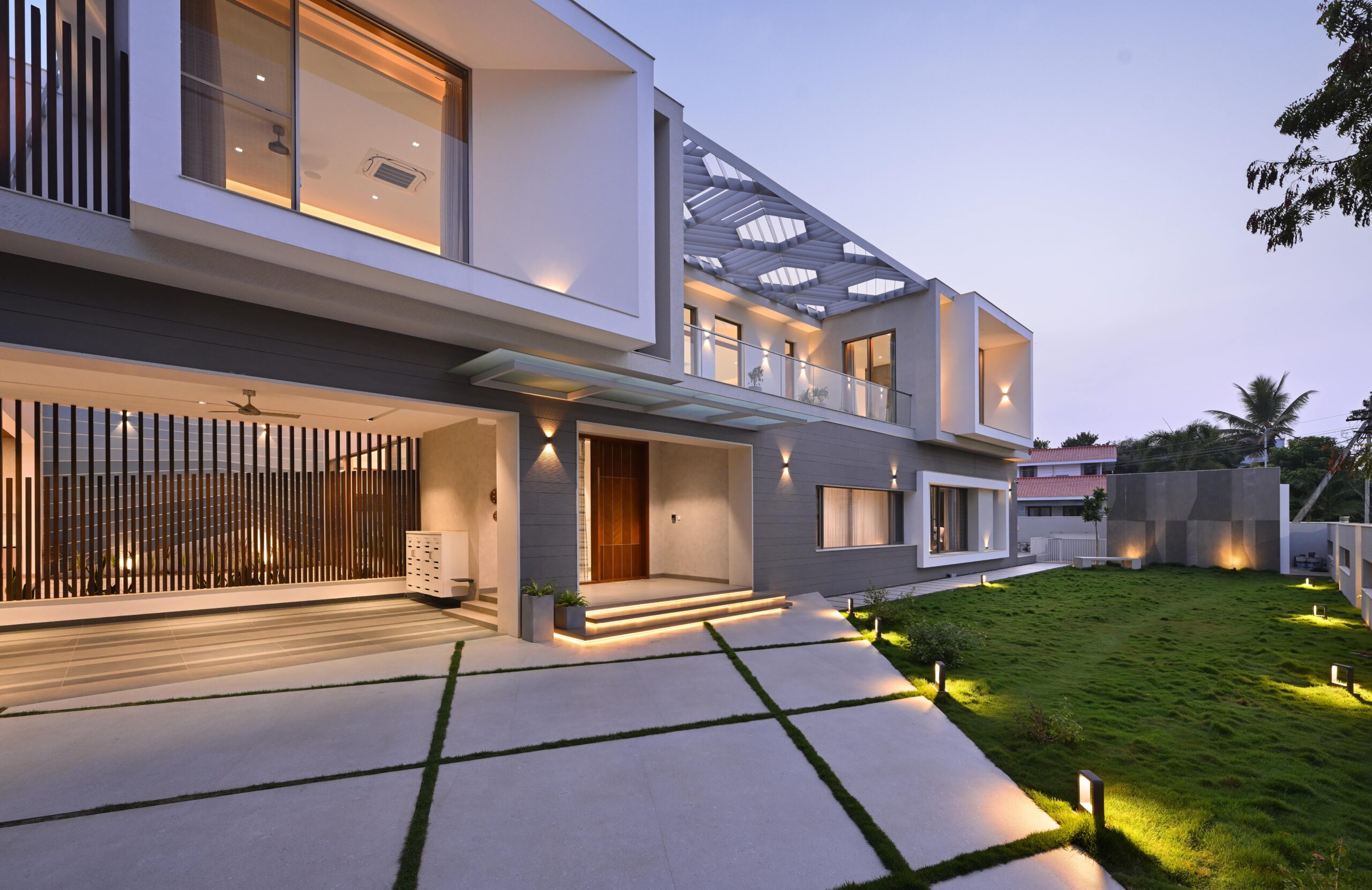 The form is carved from a box to create shaded terraces, overlooking balconies, and French windows that respond to the site’s verdure. The delicate steel pergola intrigues, allowing the white shell to stand out. Articulation of rooms is Vastu-compliant, emphasizing the pivotal role of light and ventilation inside. The foyer offers subtle glimpses of communal spaces, each portraying distinct character.