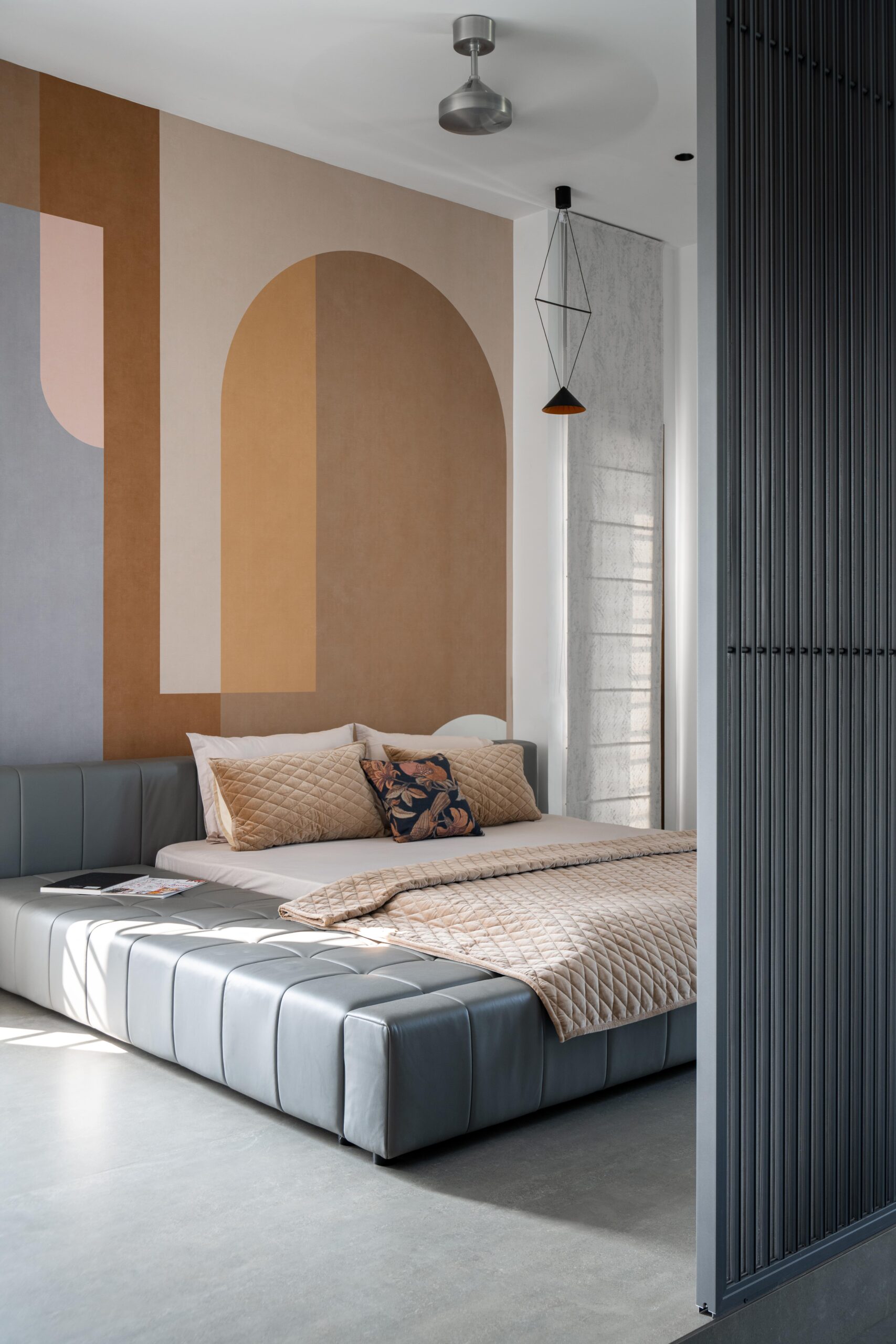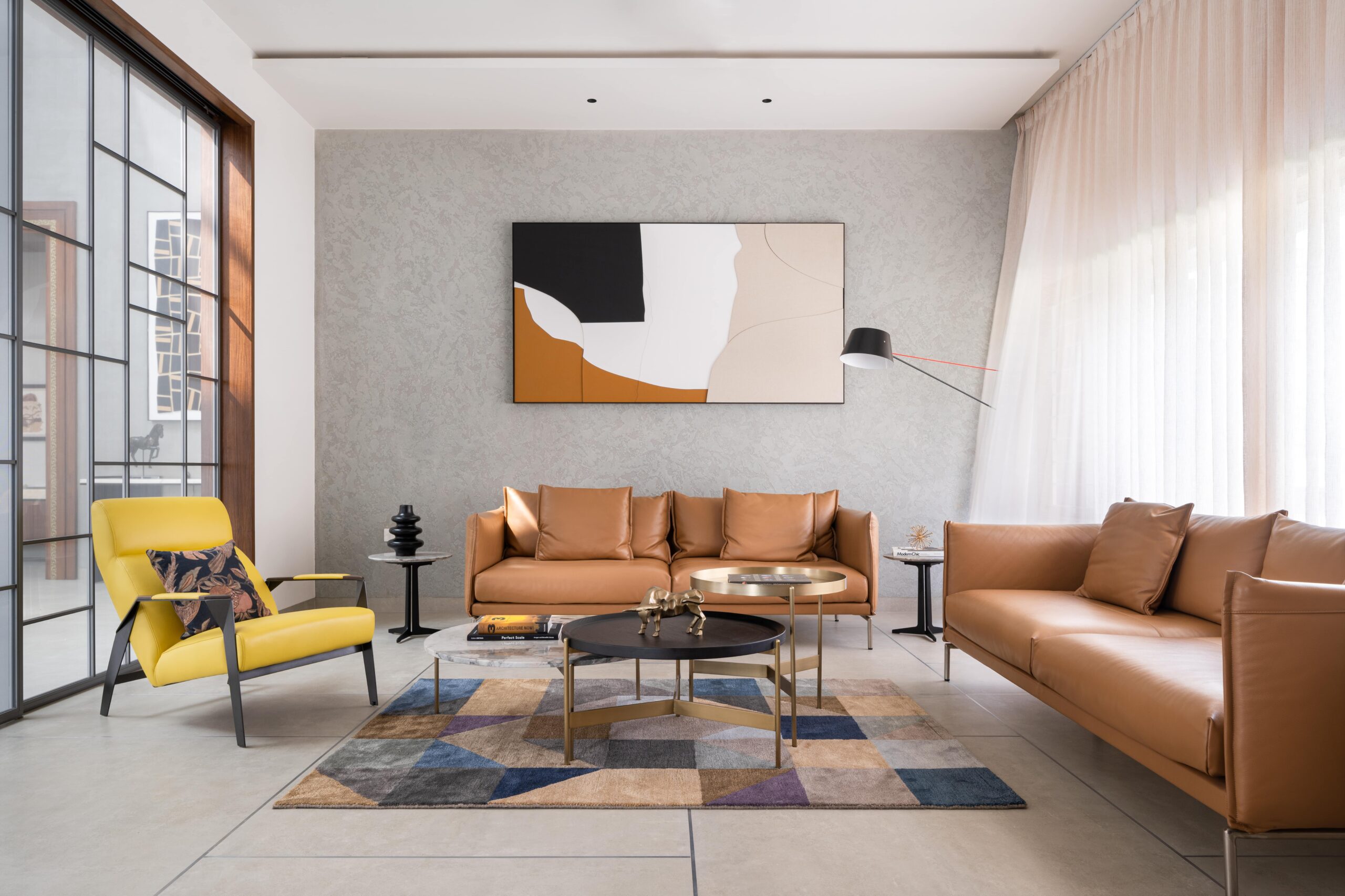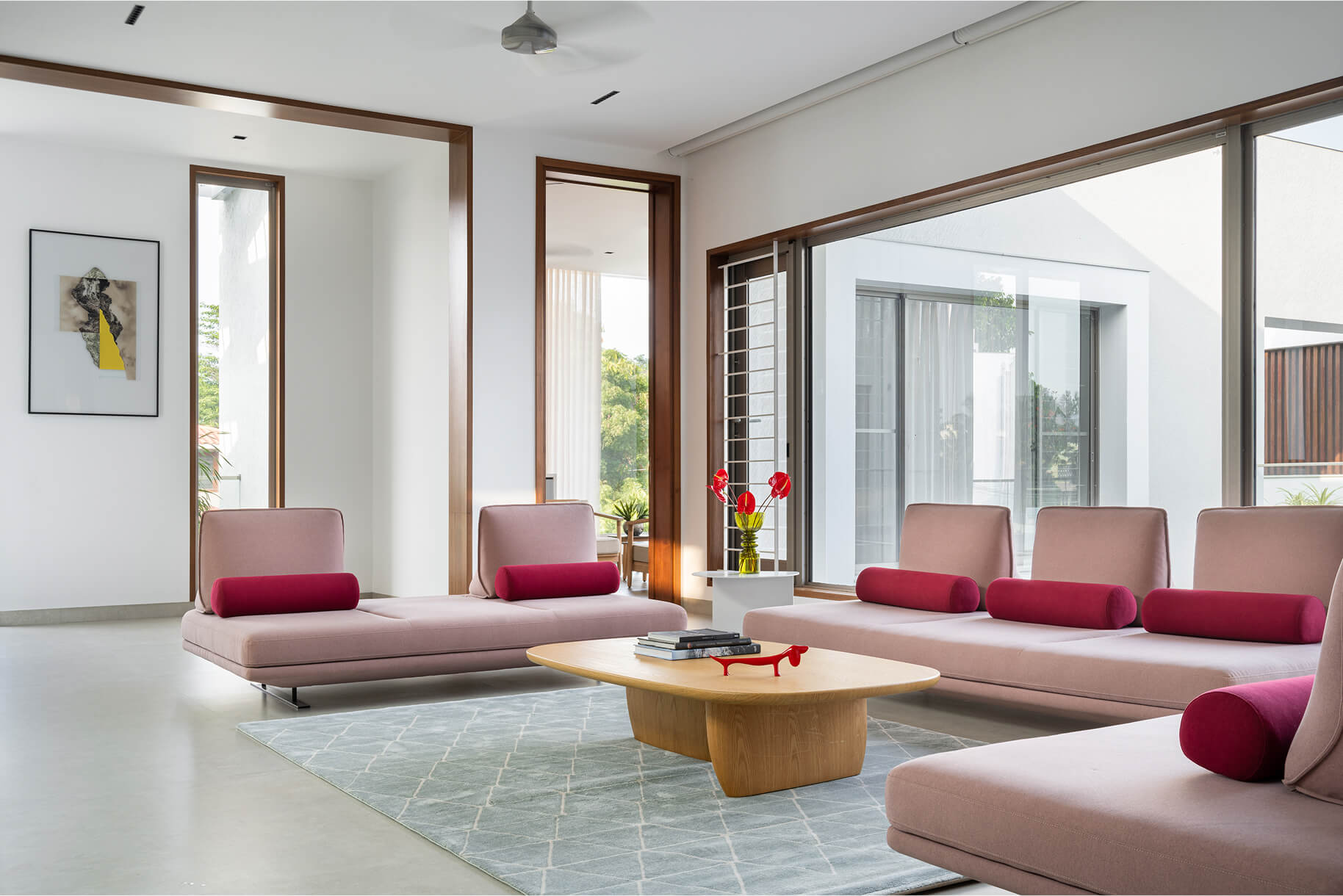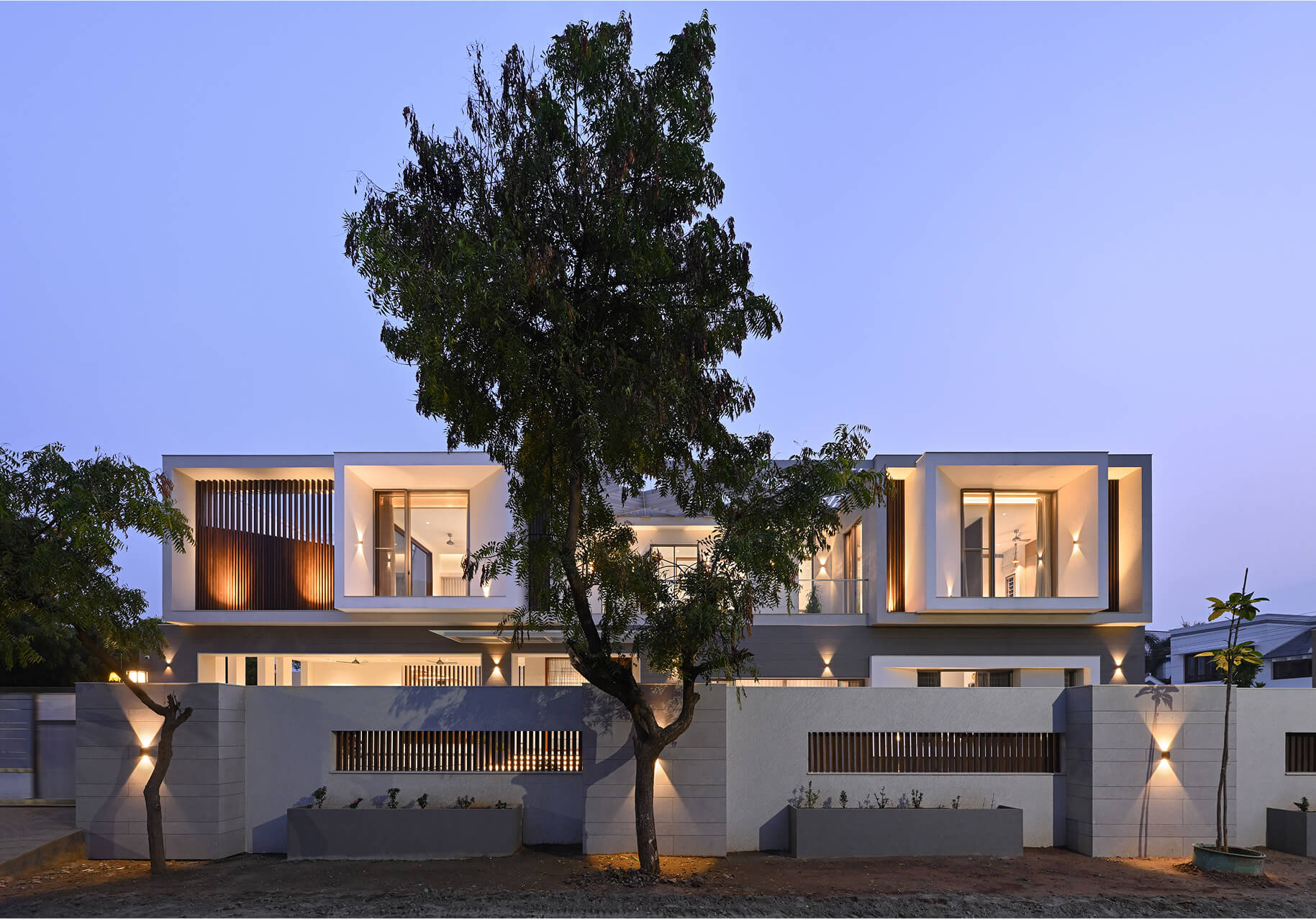 The form is carved from a box to create shaded terraces, overlooking balconies, and French windows that respond to the site’s verdure. The delicate steel pergola intrigues, allowing the white shell to stand out. Articulation of rooms is Vastu-compliant, emphasizing the pivotal role of light and ventilation inside. The foyer offers subtle glimpses of communal spaces, each portraying distinct character.