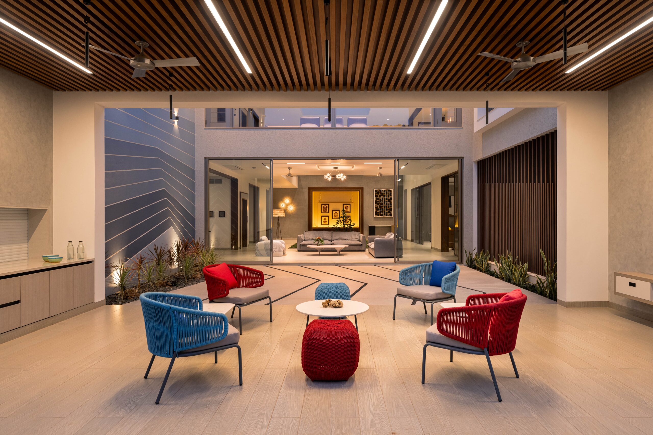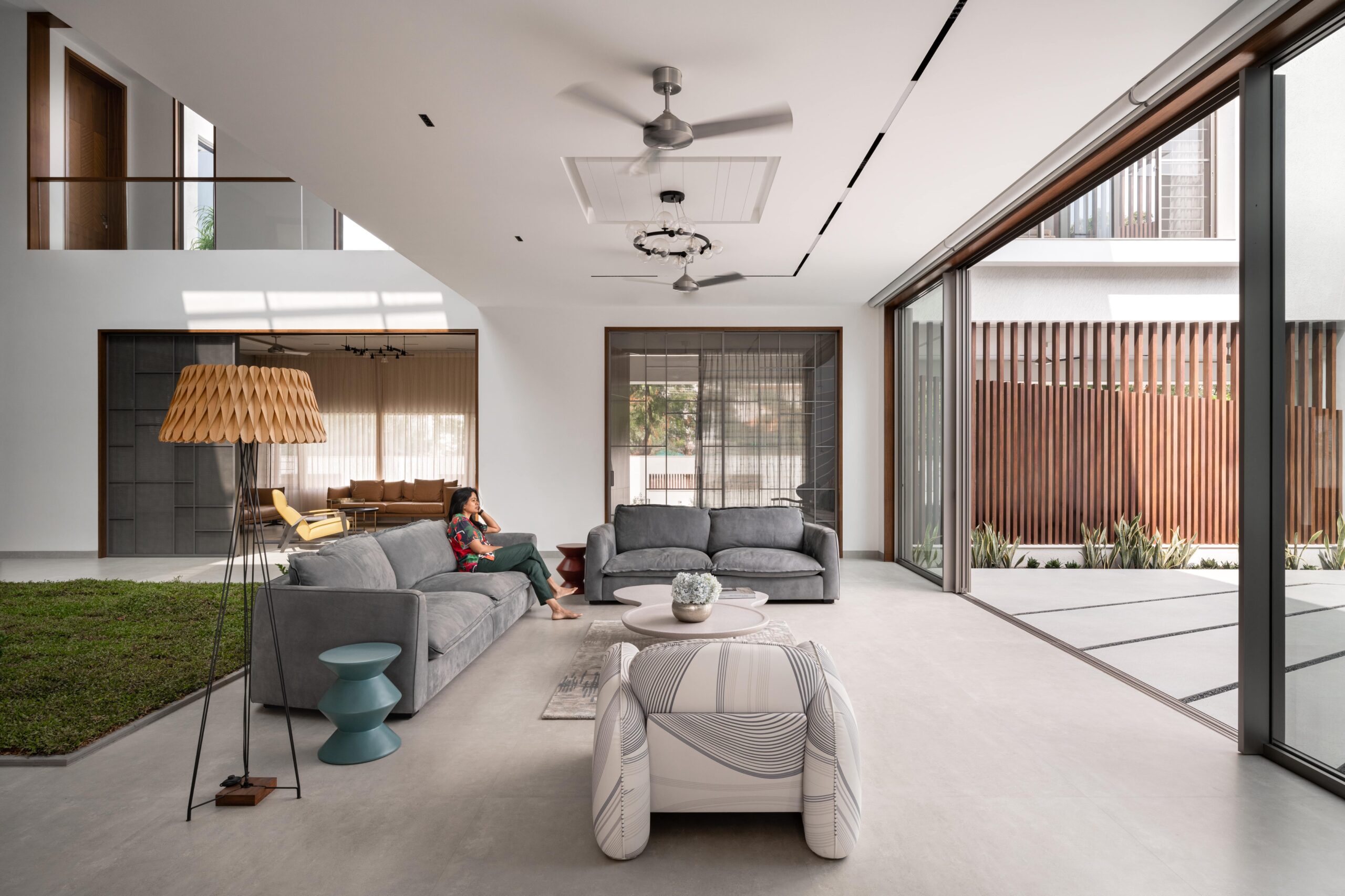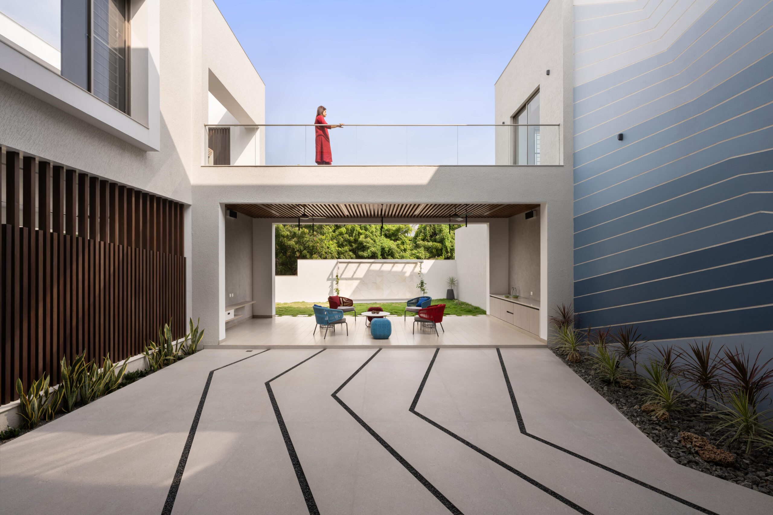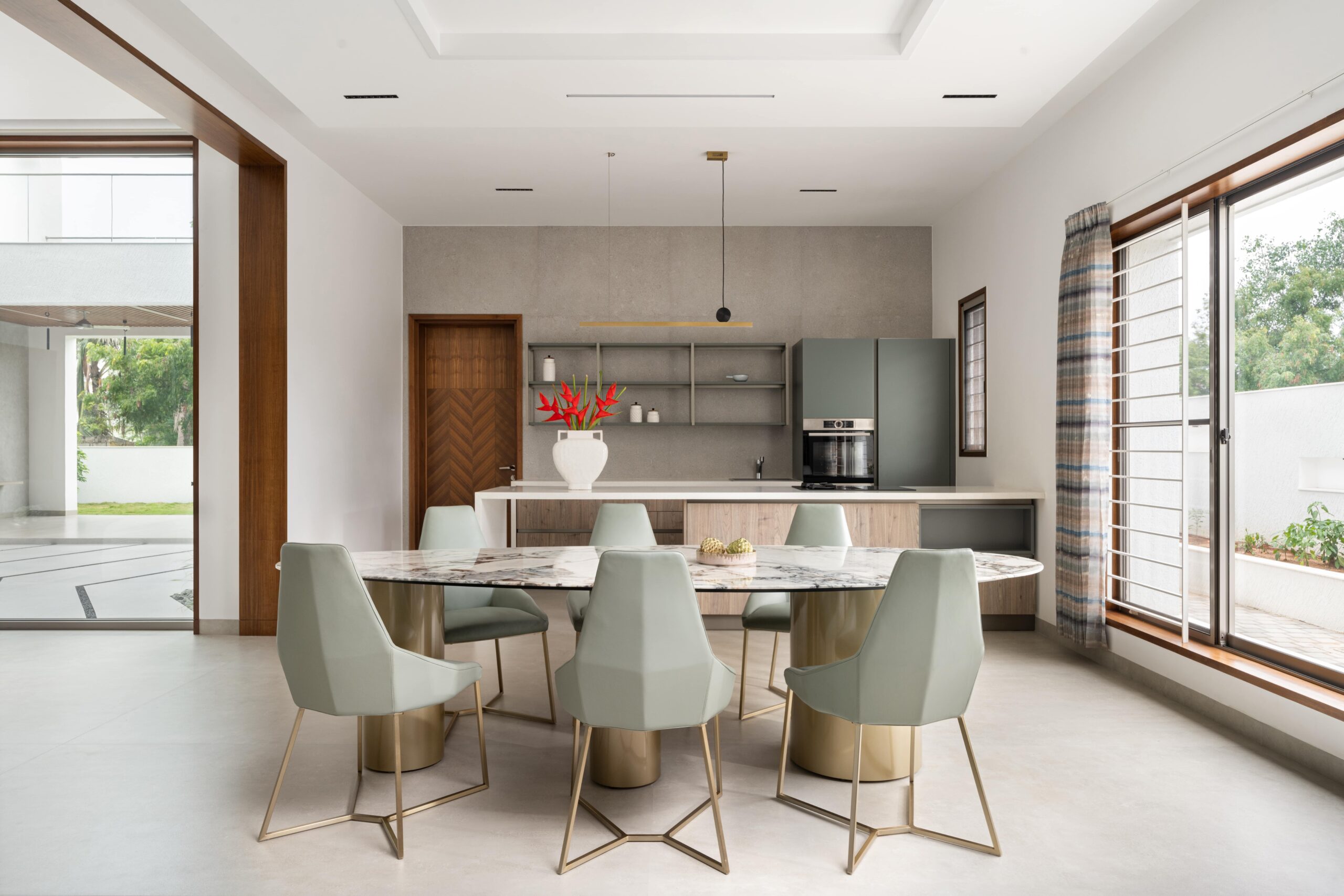 The central green courtyard, double-heighted, binds all spaces together, overlooking the kitchen, pooja room, family living, and outdoor entertainment bar. The interior backdrop is minimal having shades of brown and grey. The haven is adorned with quirky furniture, engaging décor, subtle blinds, and cozy duvets, in accordance with one’s activities inside the home.
