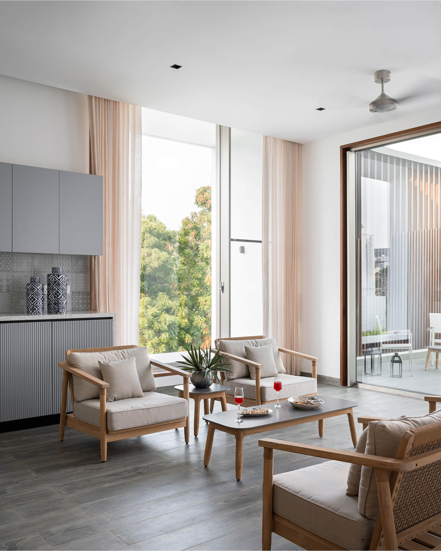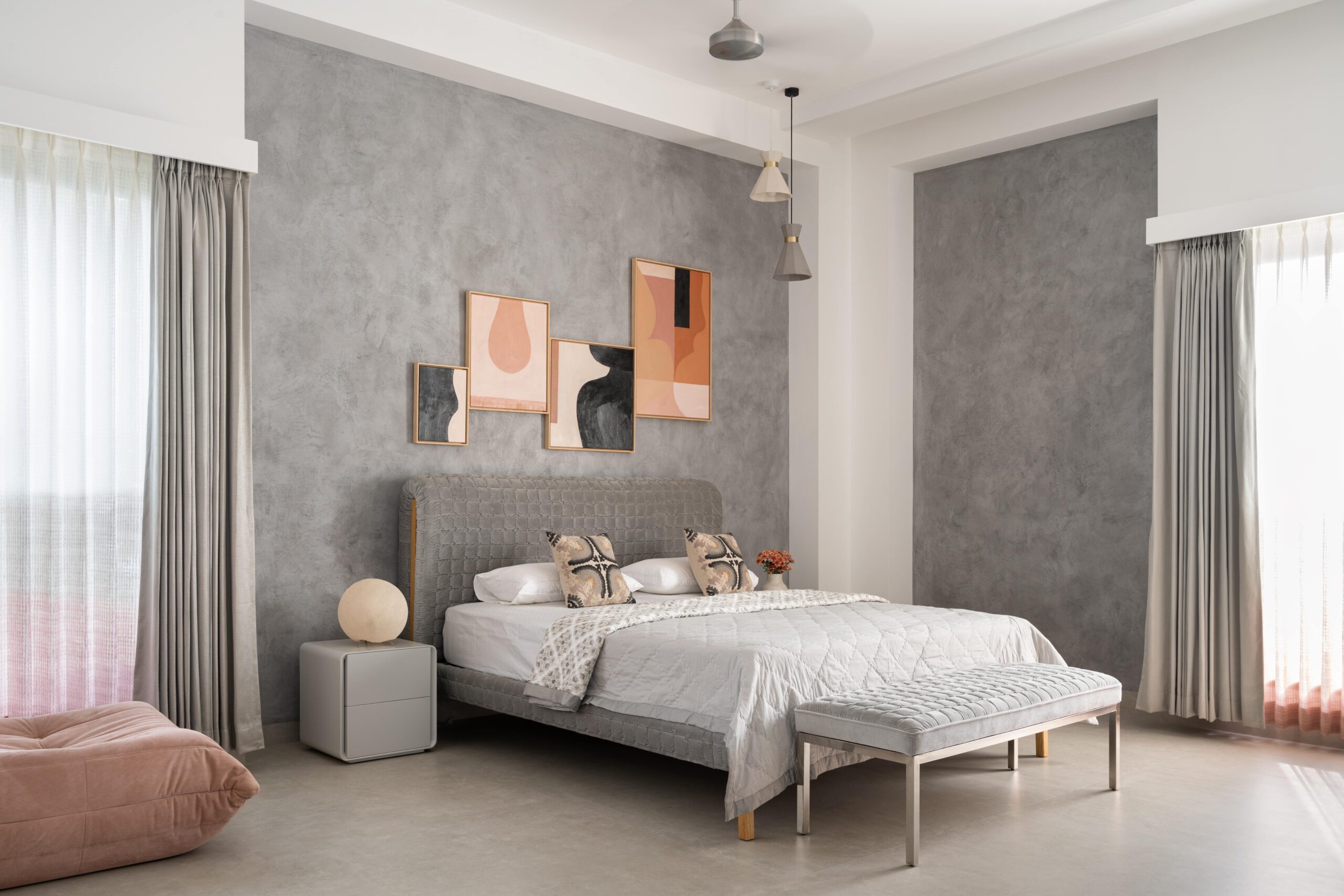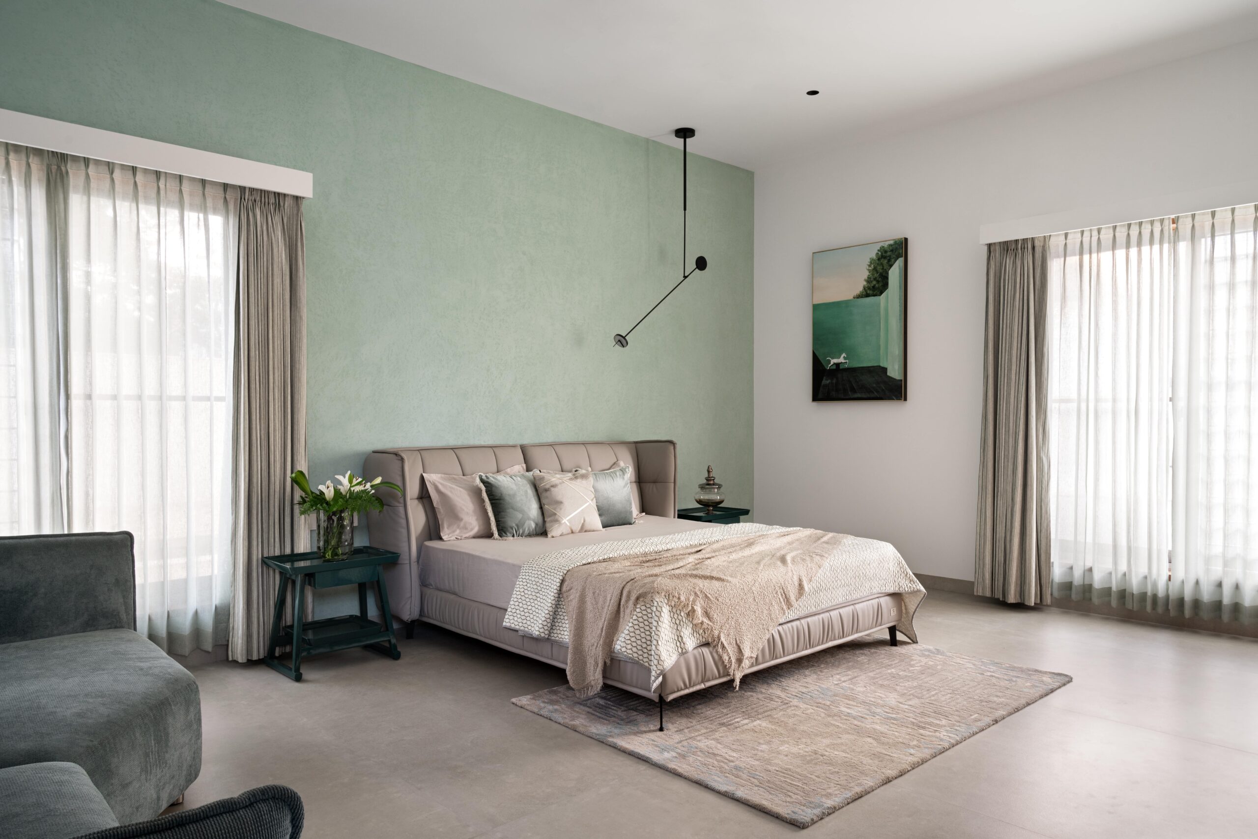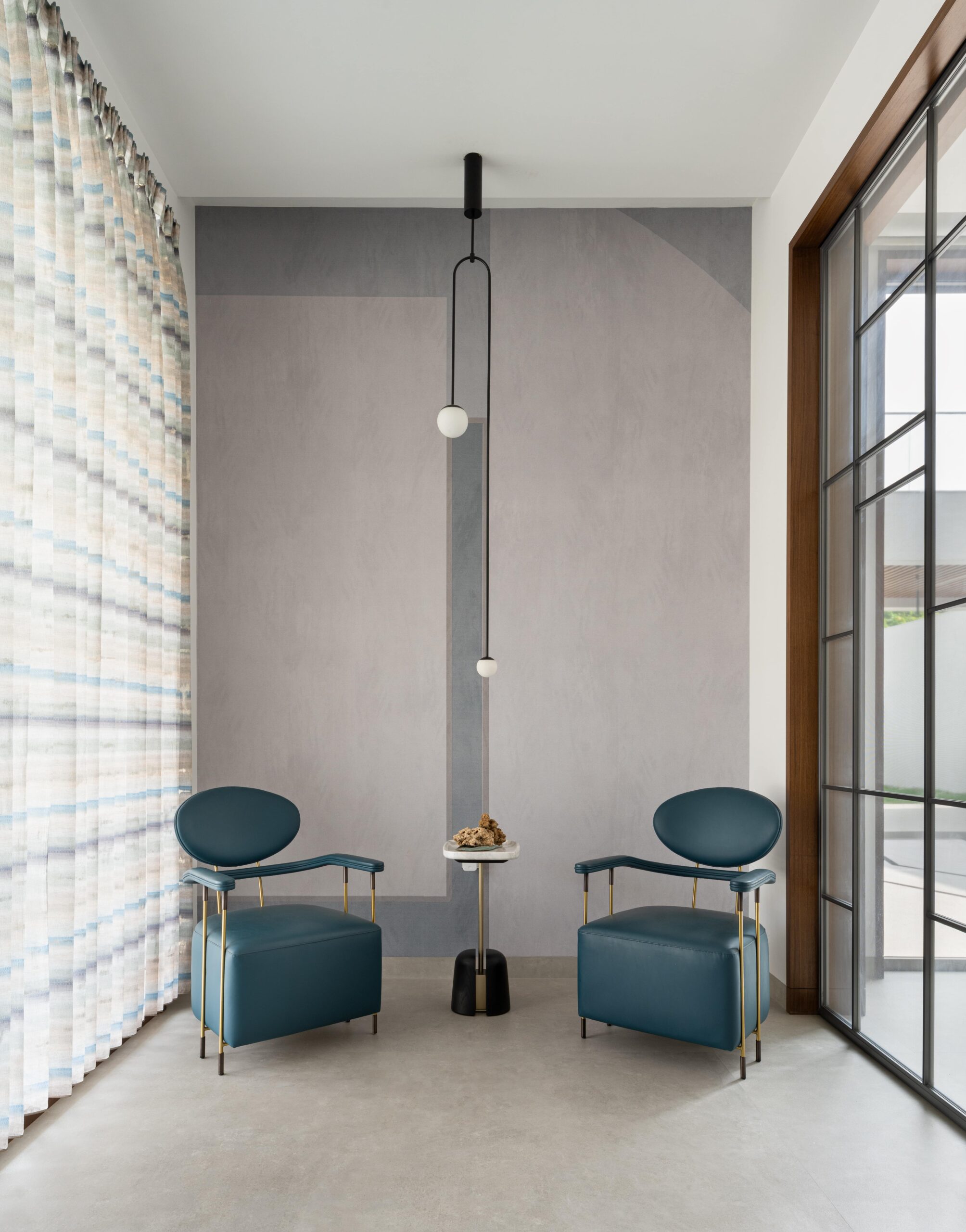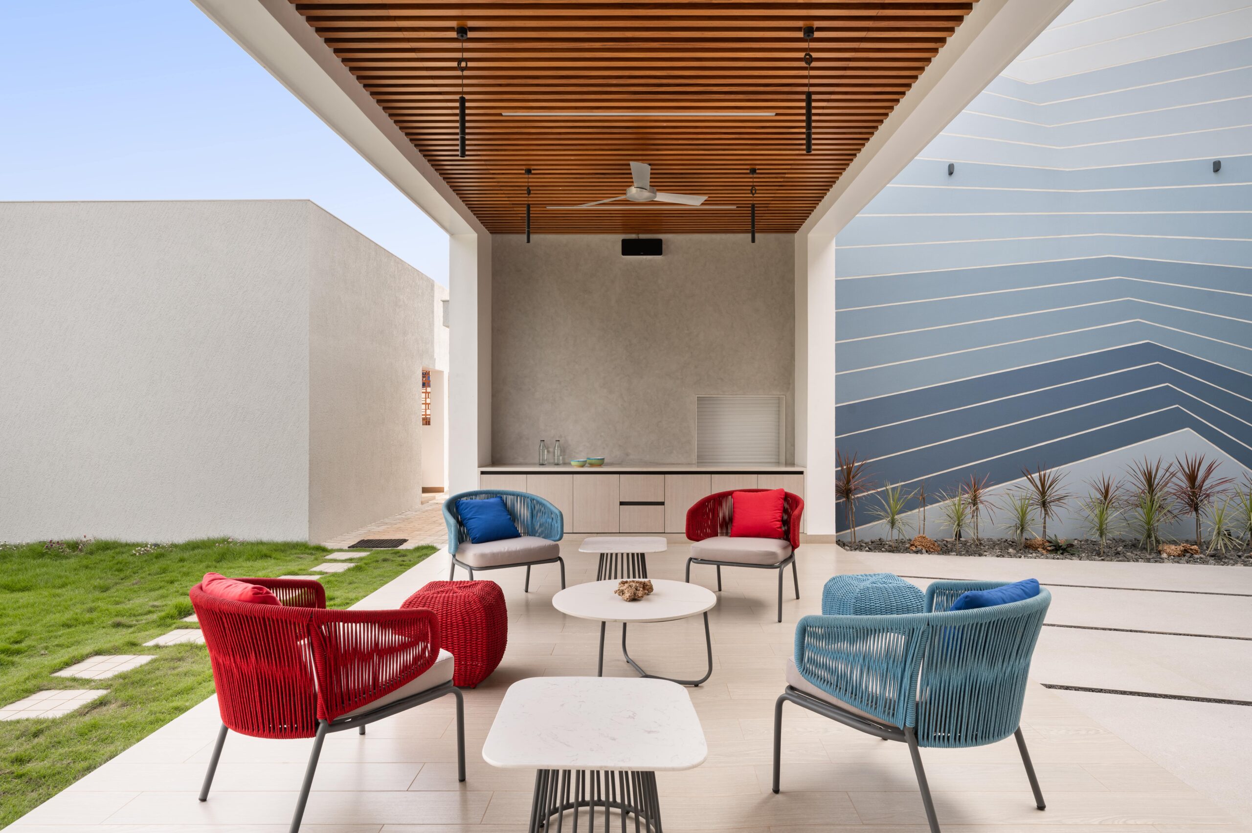 The central green courtyard, double-heighted, binds all spaces together, overlooking the kitchen, pooja room, family living, and outdoor entertainment bar. The interior backdrop is minimal having shades of brown and grey. The haven is adorned with quirky furniture, engaging décor, subtle blinds, and cozy duvets, in accordance with one’s activities inside the home.