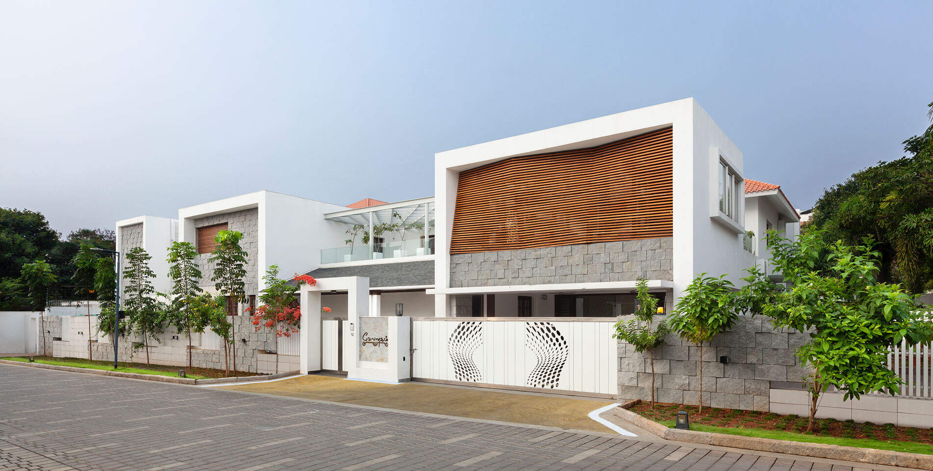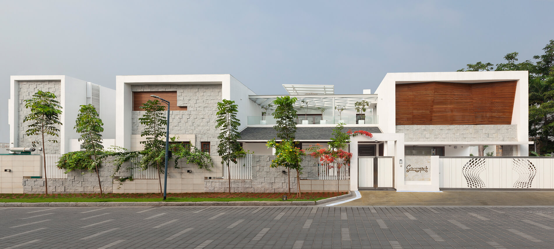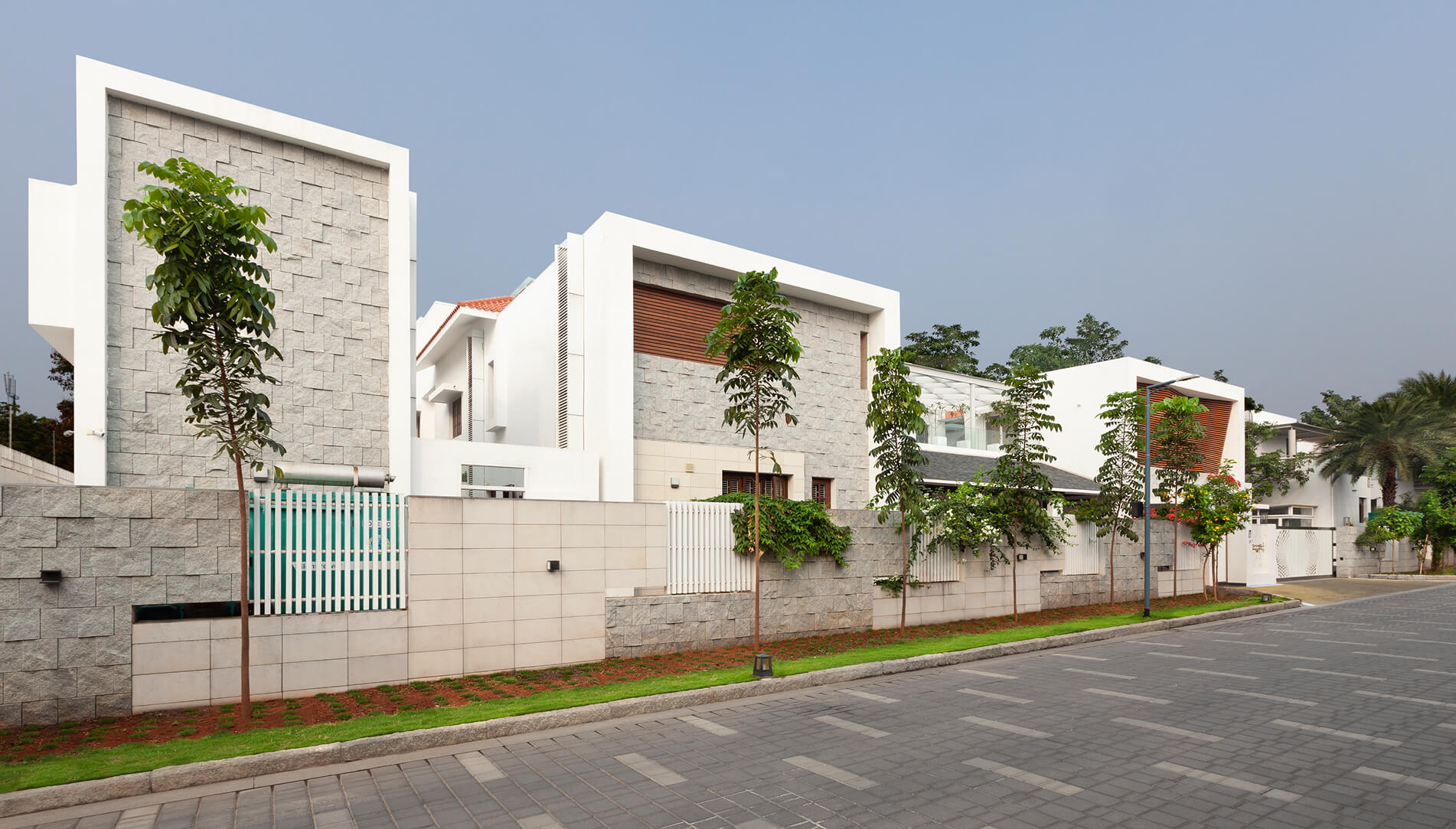 A renovation project that sports two identical solids fastened by an open terrace only distinguished by the patterns formed by the adorned materials. While one calls for a multi-faceted louvred façade, the other challenges the planar geometries. The material palette is minimal with the use of ashlar masonry and angular wooden louvres. The terrace is punctured with several openings to foster movement and circulation in the outdoors. The vegetation on the site peripheries visually blocks the terrace from the street for a higher level of privacy. At the same time, the foliage decorates the terrace with its shadows to make the space more functional during the summer.